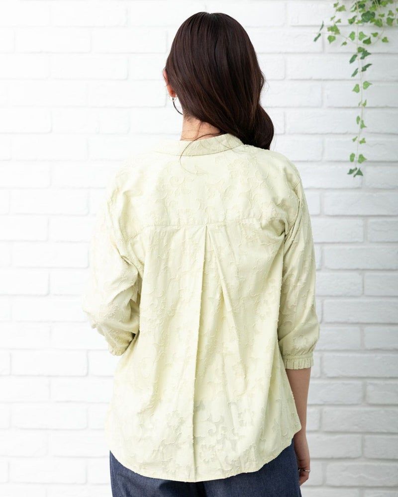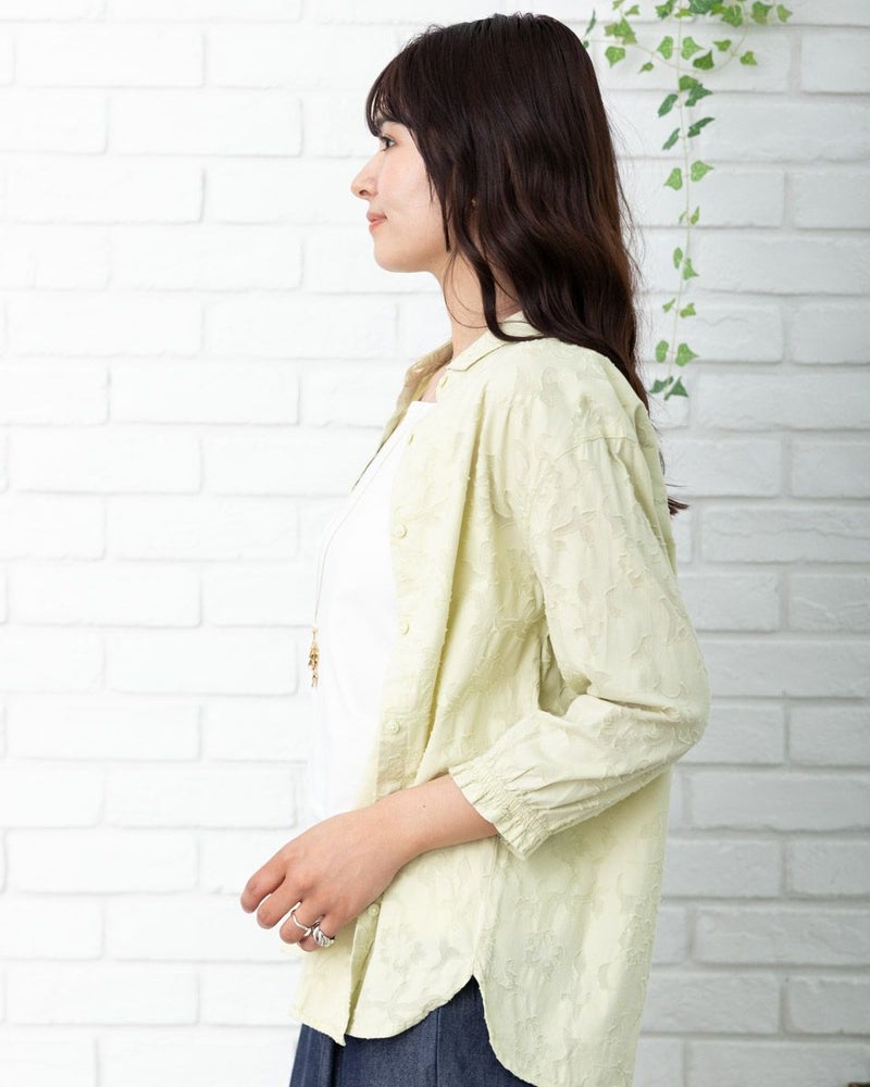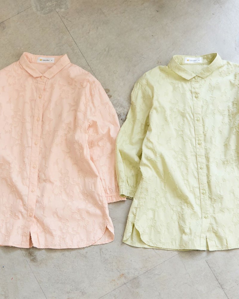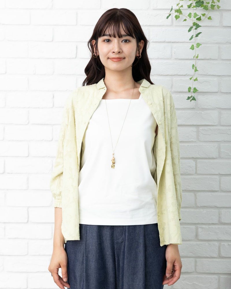 サステナブルな廃棄食物由来染料を使用したナチュラルなカラーリングのブラウスです。カットジャカードがトレンド感を装い、小さな襟がキチンと感を演出し、袖口ゴム使用で軽やかに着こなせます。 モデル身長: 168 cm 着用サイズ: M サイズ Golden Bear WOMEN ブラウス (WOMEN) 【着用アイテム】467R4411 タンクトップ 468R3760 ストレートパンツ 467R4036 トートバッグ