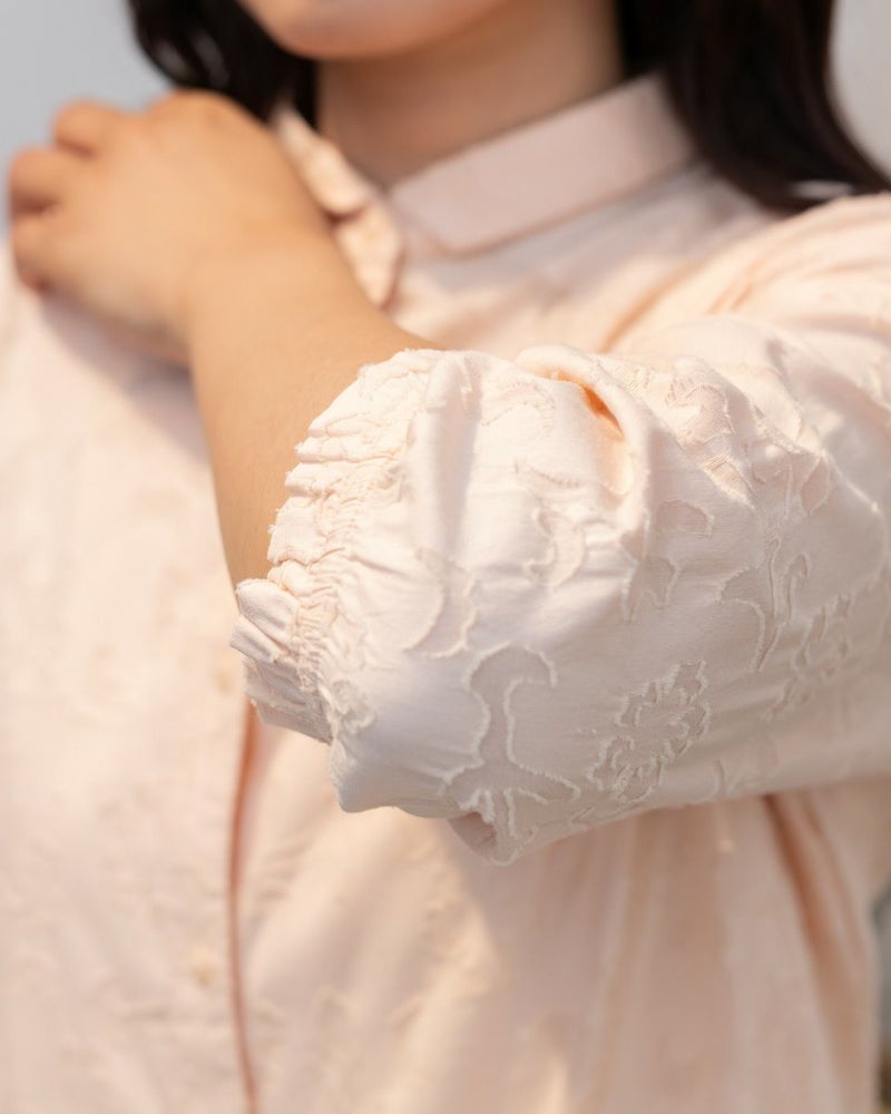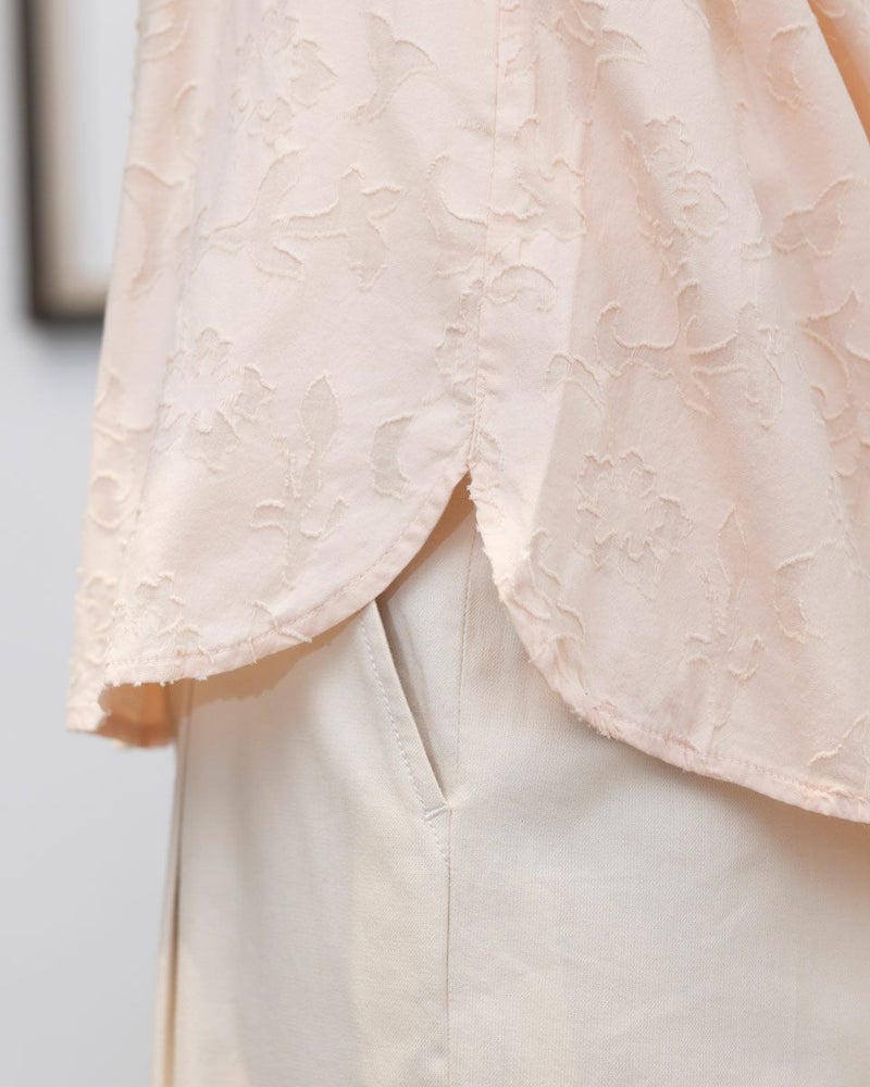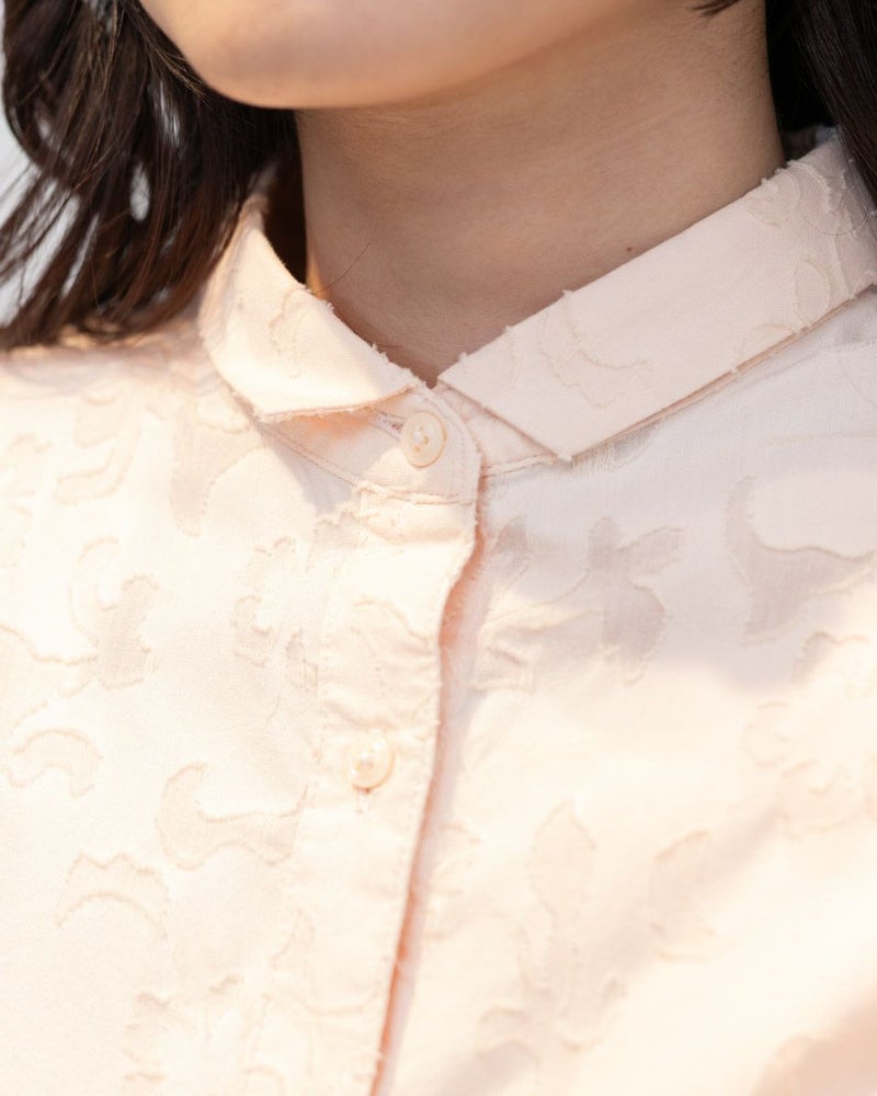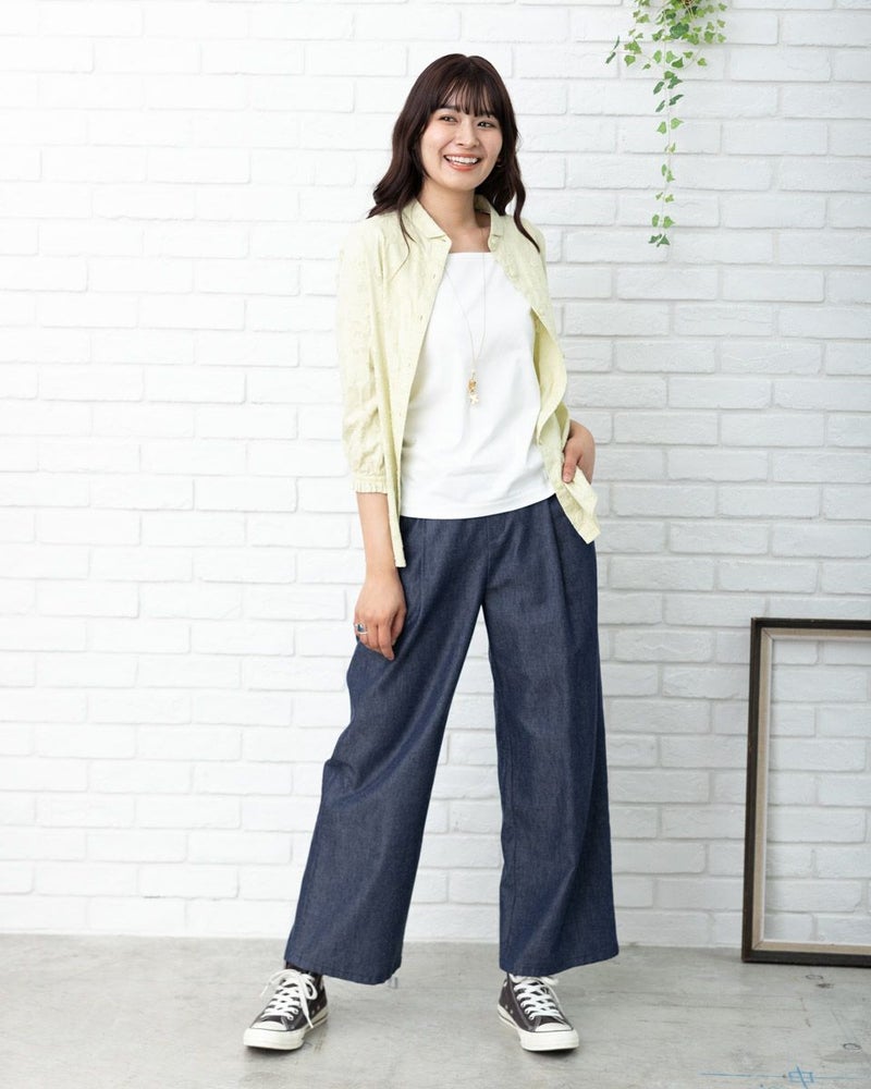サステナブルな廃棄食物由来染料を使用したナチュラルなカラーリングのブラウスです。カットジャカードがトレンド感を装い、小さな襟がキチンと感を演出し、袖口ゴム使用で軽やかに着こなせます。 モデル身長: 168 cm 着用サイズ: M サイズ Golden Bear WOMEN ブラウス (WOMEN) 【着用アイテム】467R4411 タンクトップ 468R3760 ストレートパンツ 467R4036 トートバッグ