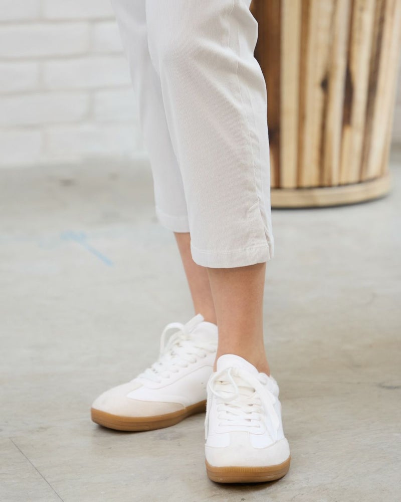 横ストレッチのレーヨン・ナイロン素材を使用したクロップドパンツです。ベーシックなテーパードシルエットで両脇裾にスリットが有ります。コードレーン(コード織り)と言う織りで表面に細いストライプ状の凹凸が有ります。先染めで2色の色を織り込み細かいストライプに仕上げました。ウエスト後ろのみ平ゴムを入れ伸びる仕様にしています。 モデル身長: 167 cm 着用サイズ: 61 サイズ Golden Bear WOMEN ボトムス (WOMEN) 同デザイン大きい(3L,4Lサイズ)はこちら 【着用アイテム】467R6312 ピケブラウス 467R6411オーガニックコットン切替レースTシャツ