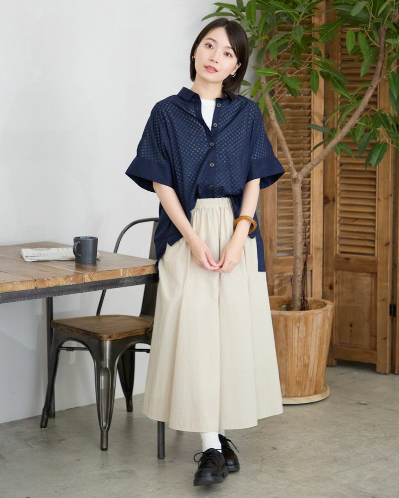 水玉柄にオパール加工した綿ポリエステル素材のブラウスです。(オパール加工とは薬品で繊維の糸を溶かし透かし模様を作る加工のこと)身頃は分量をゆったりととり、袖は五分丈のドルマンスリーブになります。台襟付きシャツカラーで前開きのデザインなので羽織としても着用頂けます。裾は前後差をつけ、前の両脇はラウンドせさせて、後ろは直線のスリットにしています。色はアイボリーとネイビーの2色展開になります。