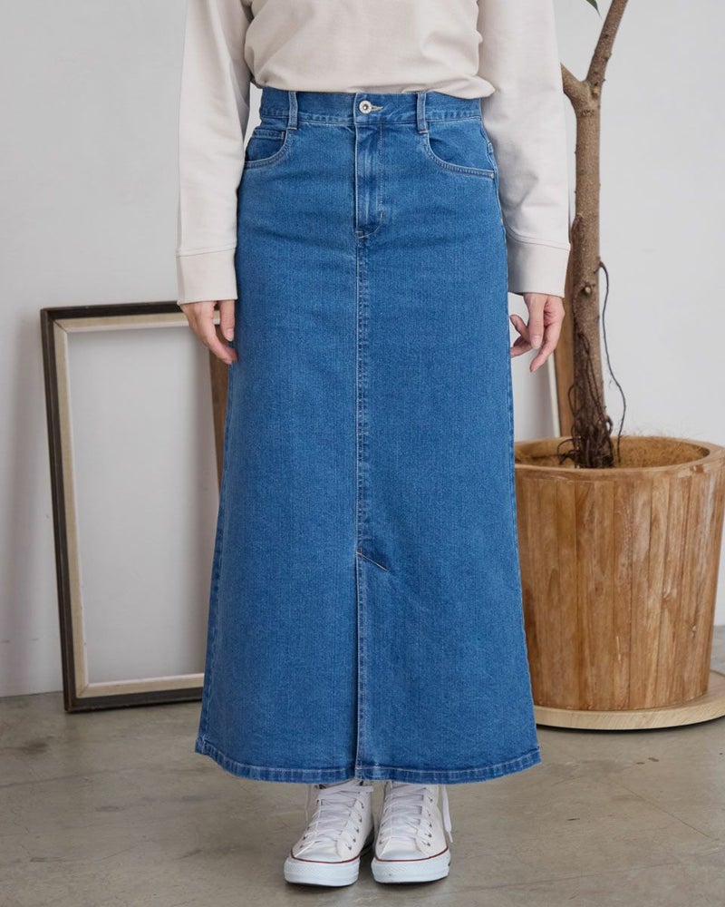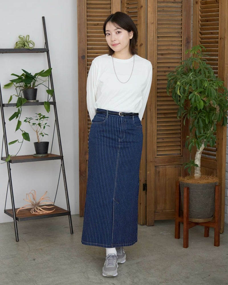 デニム素材のAラインのロングスカートです。前中心ファスナー開きで足さばきを良くするためにベンツを入れています。 モデル身長: 162 cm 着用サイズ: 61 サイズ Golden Bear WOMEN ボトムス (WOMEN) 【着用アイテム】467RC410 切り替えカットソー 467RC414 天竺無地・ボーダー長袖Tシャツ 467RD334 チェックネルシャツ 467RE412 ハイネックカットソー 467RE601 ラクーン混カーディガン