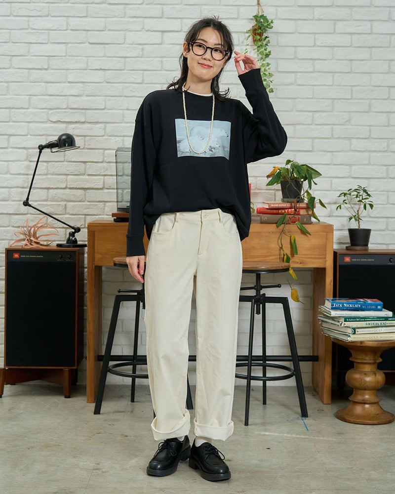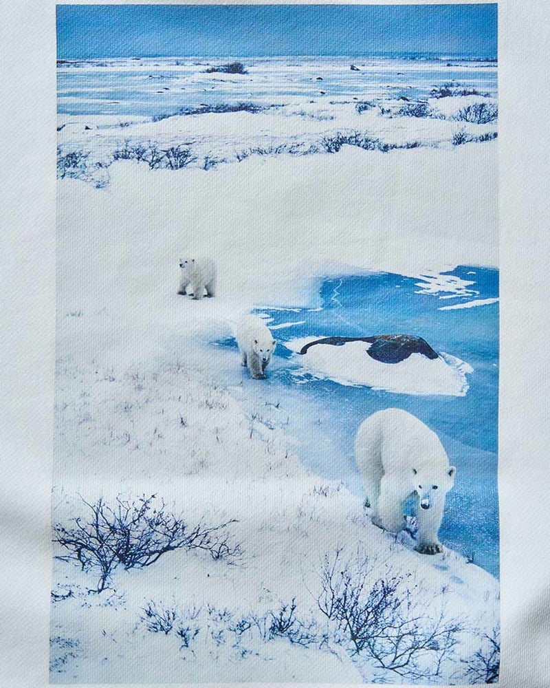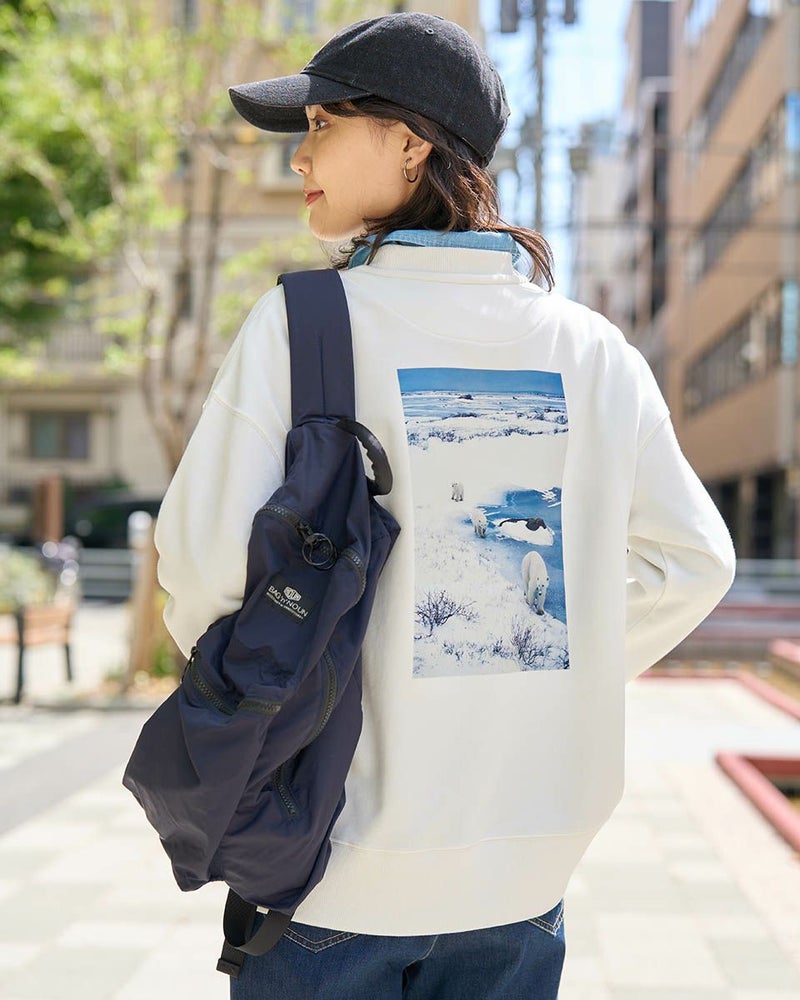 地球環境に貢献したいという想いから、温暖化の象徴であり絶滅危機にあるシロクマをモチーフにした写真を使用しています。オーガニックコットン100%のボディにプリントされた白くまの写真が、シンプルな中にも遊び心を添えます。カラーはベーシックなブラックとアイボリーの2色展開。アイボリーはバッグプリント、ブラックは正面にモノトーン写真をプリントしています。