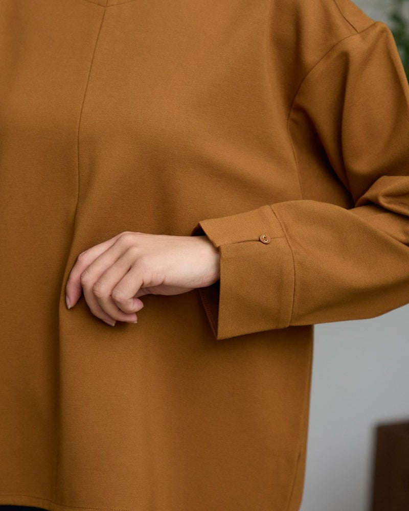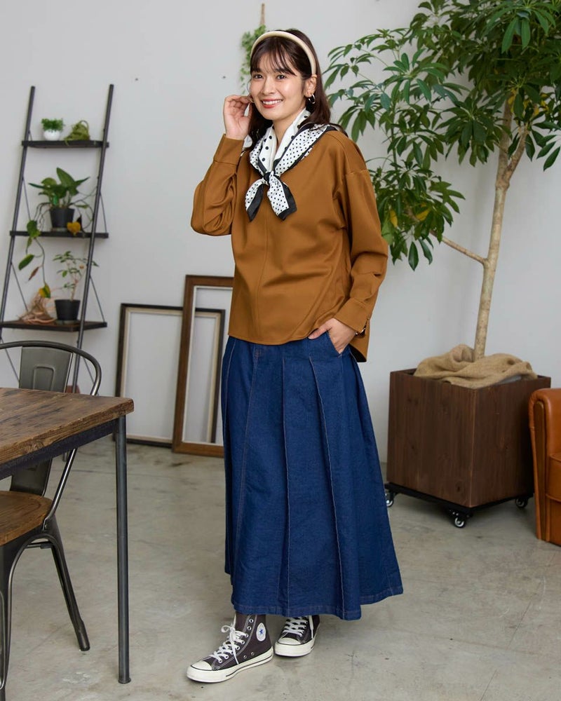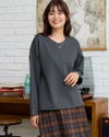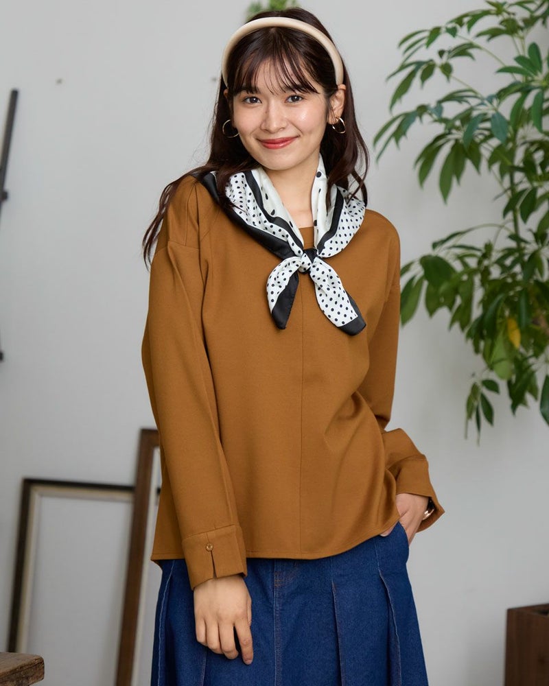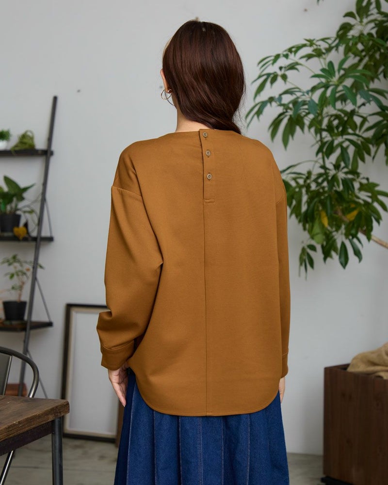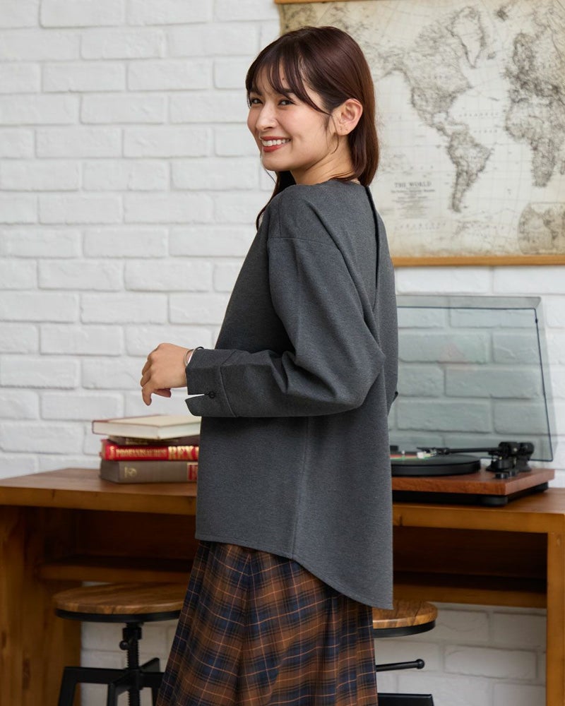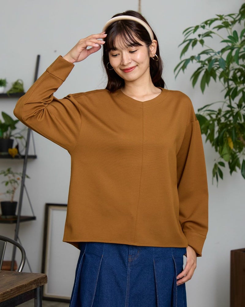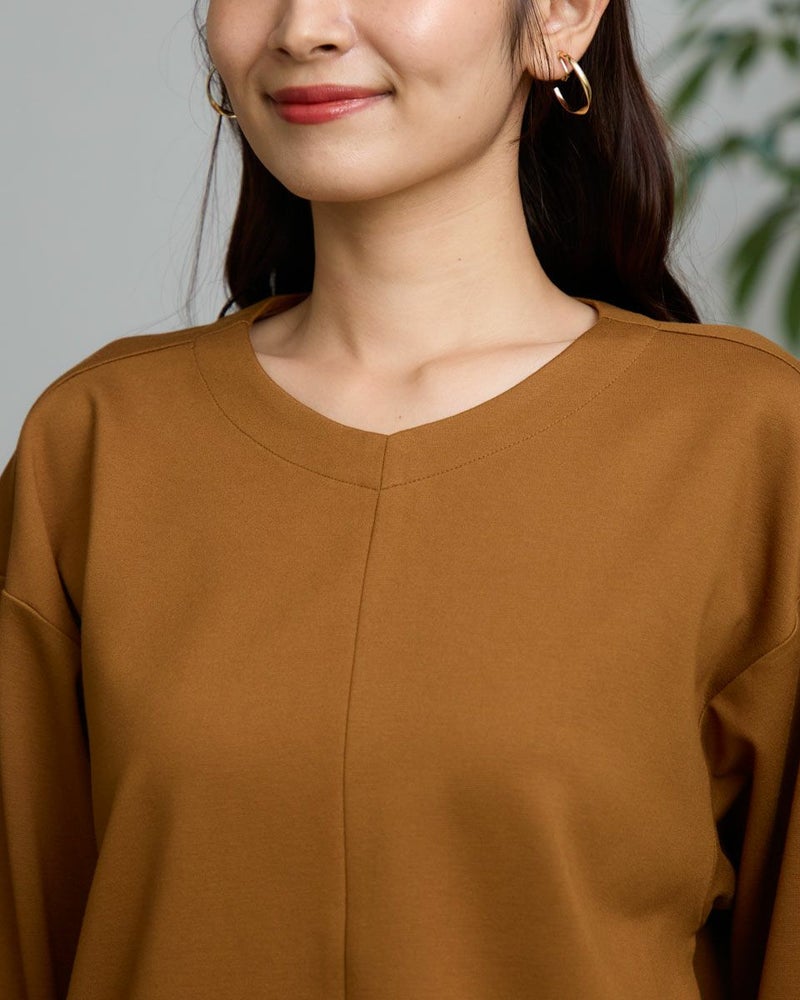 キメの整った編地が上品なポンチを使ったプルオーバー。滑らかな手触りで四方のテンションに優れていますが、適度にハリがありダレず身体に張り付きにくい点も魅力。肩を落とし、ゆとりのある身頃とヒップにかかる着丈でリラックス感があり、程よいツヤで砕けた印象が薄れブラウスのようにキレイめにお召しいただける1着。浅いV字のネックラインは首元をスッキリと見せ真面目すぎない抜け感も素敵です。気温に応じてタートルカットソーやロンTを重ねてラフにアレンジもおすすめ。同素材のパンツ468RD751とセットアップで着用する時はジュエリーやリップでツヤを添えると部屋着感も薄れ素敵にまとまります。