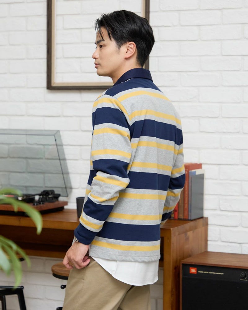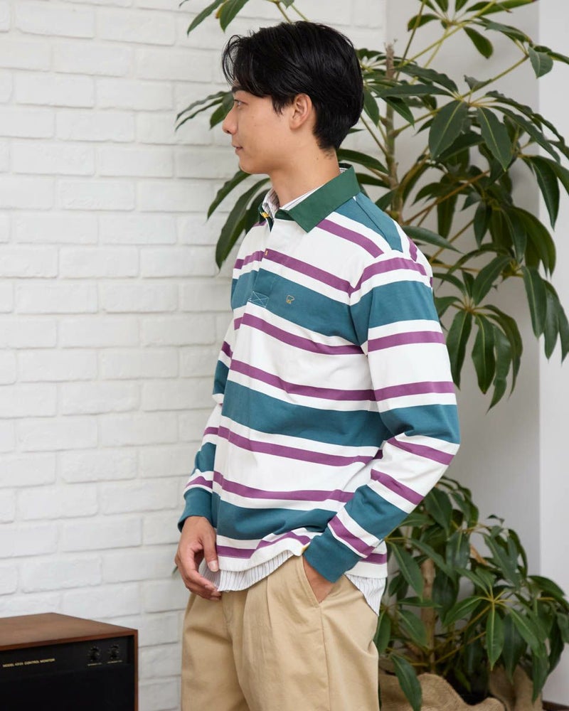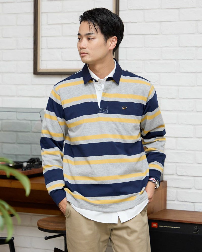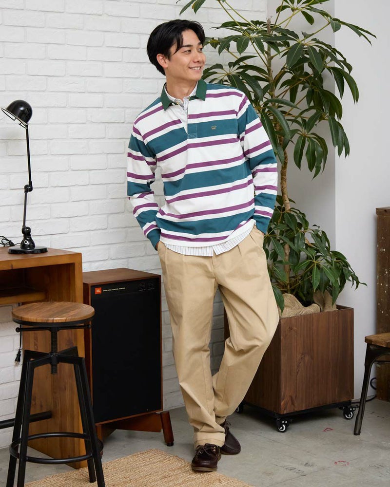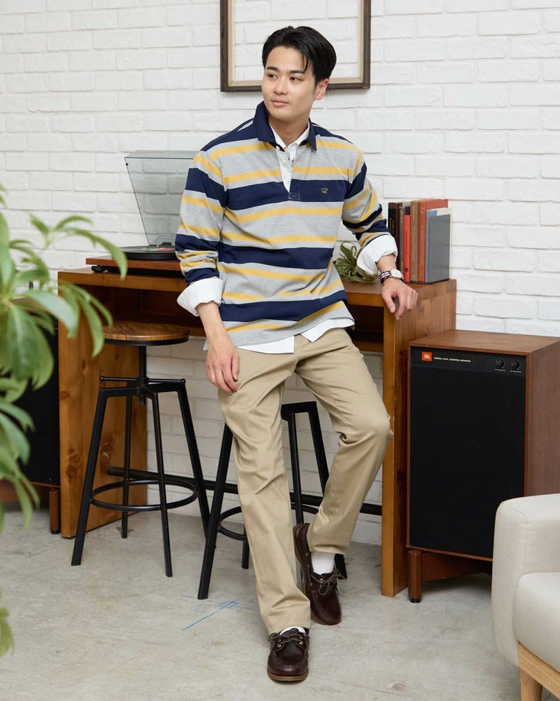 1枚でコーディネートの主役になるラガーシャツです。太ボーダーは視覚的なインパクトが強く、シンプルなボトムと合わせるだけでスタイルが完成します。通常のラガーシャツよりも薄く軽い素材でつくっているので重ね着もしやすいのが特徴です。 モデル身長: 176 cm 着用サイズ: L サイズ Golden Bear MEN カットソー (MEN) 【着用アイテム】314R8102 ドライビングジャケット 314R8403 ラペルカーディガン 314RC204 ストライプシャツ 314RC230 オックスシャツ 314R8701 チノパン 314RC700 ワイドチノ