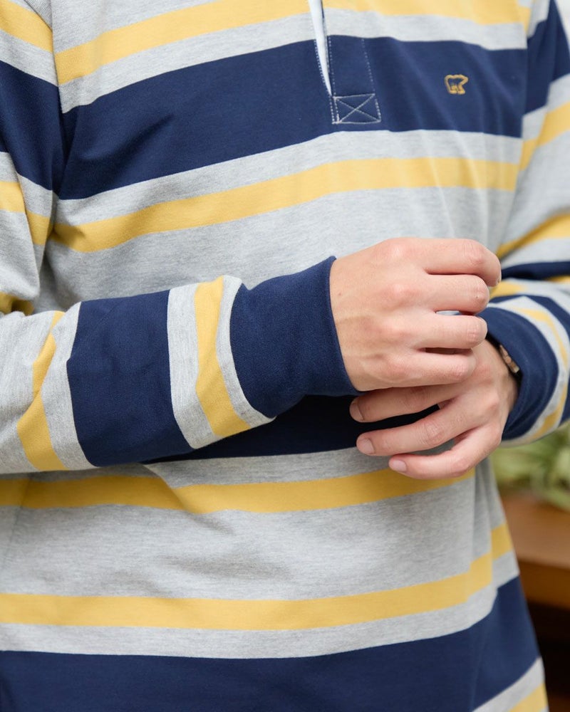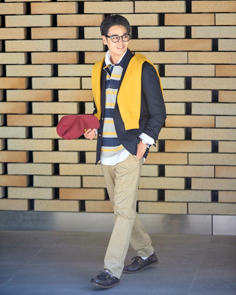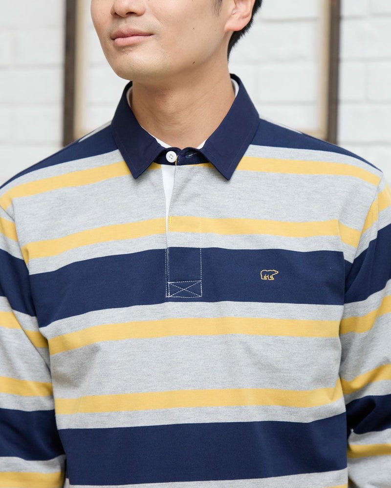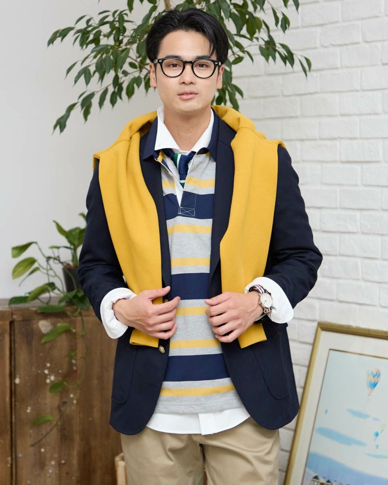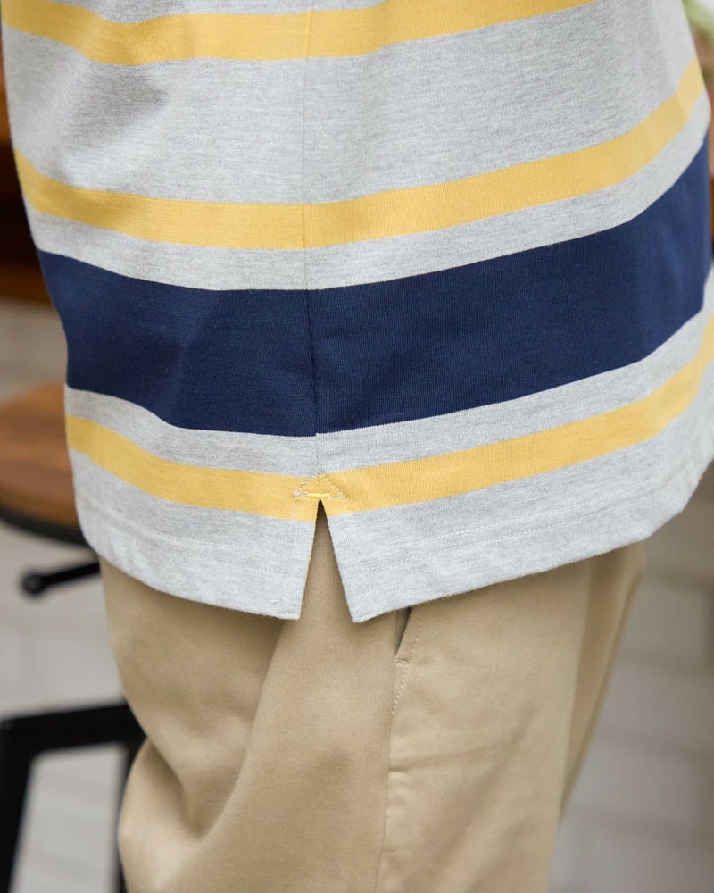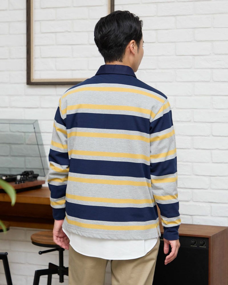 1枚でコーディネートの主役になるラガーシャツです。太ボーダーは視覚的なインパクトが強く、シンプルなボトムと合わせるだけでスタイルが完成します。通常のラガーシャツよりも薄く軽い素材でつくっているので重ね着もしやすいのが特徴です。 モデル身長: 176 cm 着用サイズ: L サイズ Golden Bear MEN カットソー (MEN) 【着用アイテム】314R8102 ドライビングジャケット 314R8403 ラペルカーディガン 314RC204 ストライプシャツ 314RC230 オックスシャツ 314R8701 チノパン 314RC700 ワイドチノ