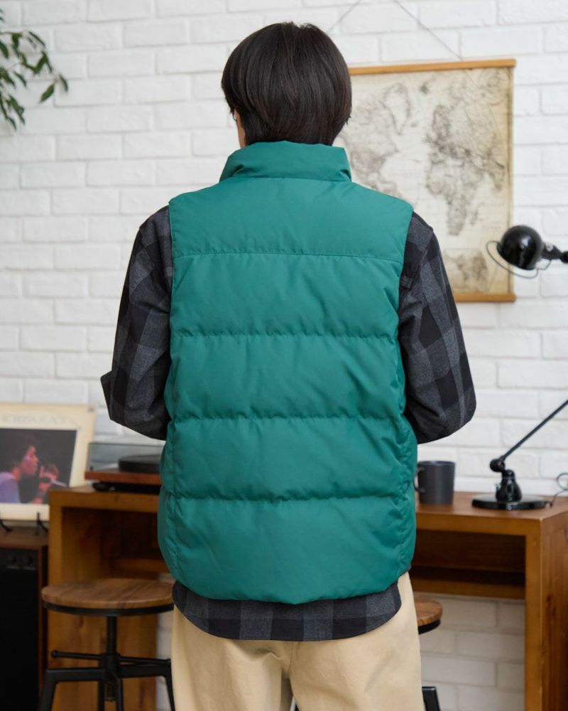 ポリエステルオックス素材を使用したドット釦仕様のダウンベストです。裏地には静電気防止生地を使用し快適な着心地が特徴です。ご家庭での手洗い洗濯が可能でお手入れが楽なのも魅力です。パーカやネルシャツ、デニムと着合わせたアメカジスタイルがオススメです。