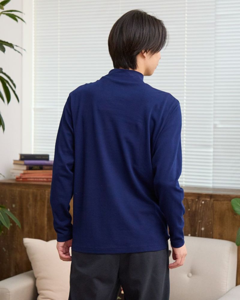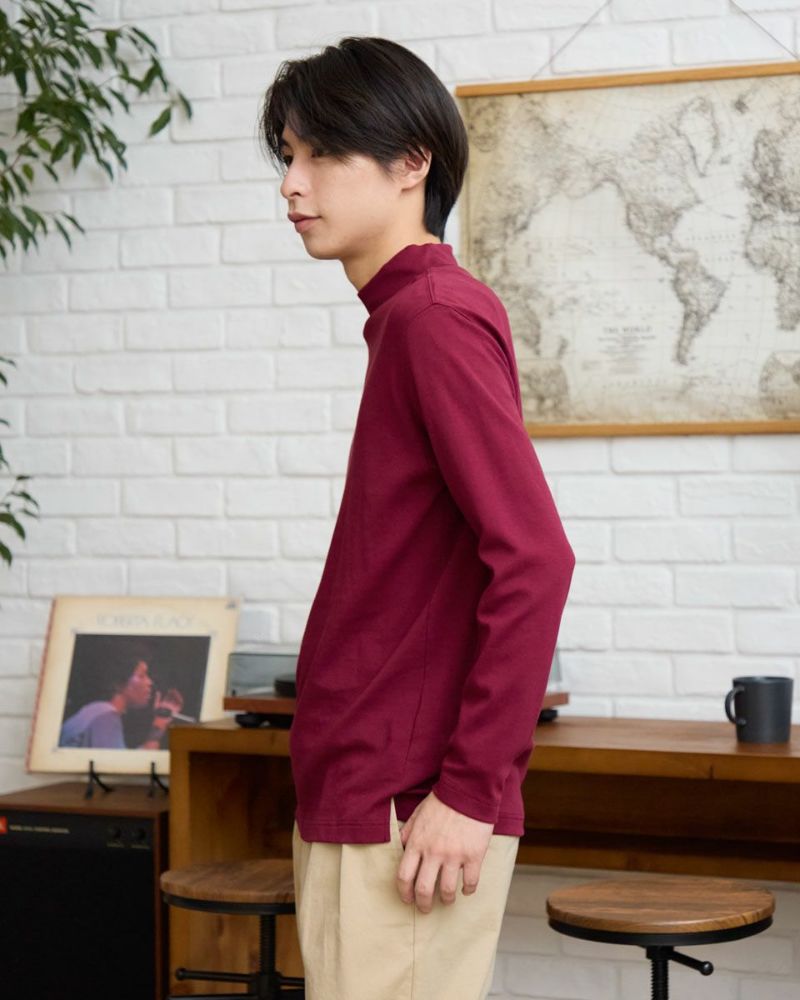 吸湿発熱性に優れたオーガニックコットン100%素材のハイネックTシャツです。人肌から放湿される湿気を生地が吸収して熱を発し暖かさを感じる素材です。コットンの繊維に機能性物質を分子レベルで結合させているので、洗濯を繰り返しても機能が低下しづらいのも特徴です。乾燥肌や敏感肌の方にもオススメで、秋から冬にかけて重宝するハイネックのTシャツです。