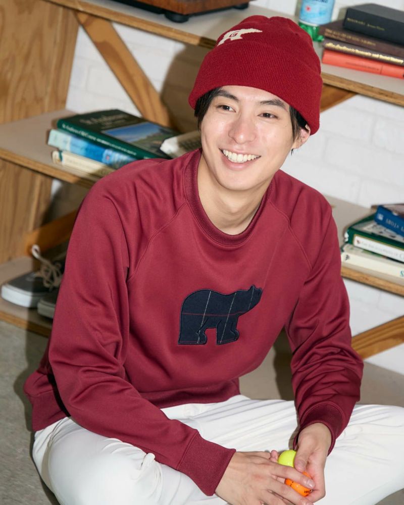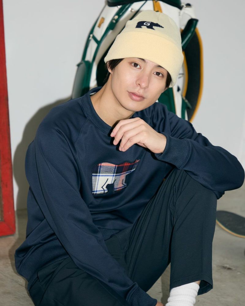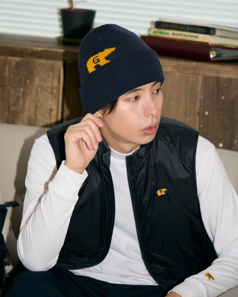 金熊のロゴが印象的なビーニーです。ロゴは正面よりも少し左右にずらして被ると、よりこなれた印象になります。寒い時期のゴルフはもちろん、普段のお散歩やお買い物などのカジュアルシーンでも大活躍するアイテムです。