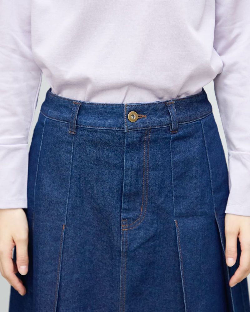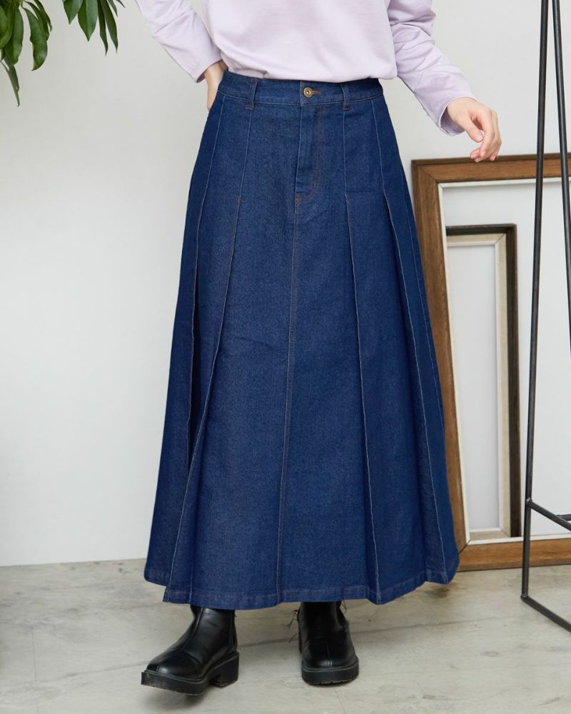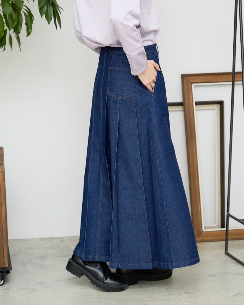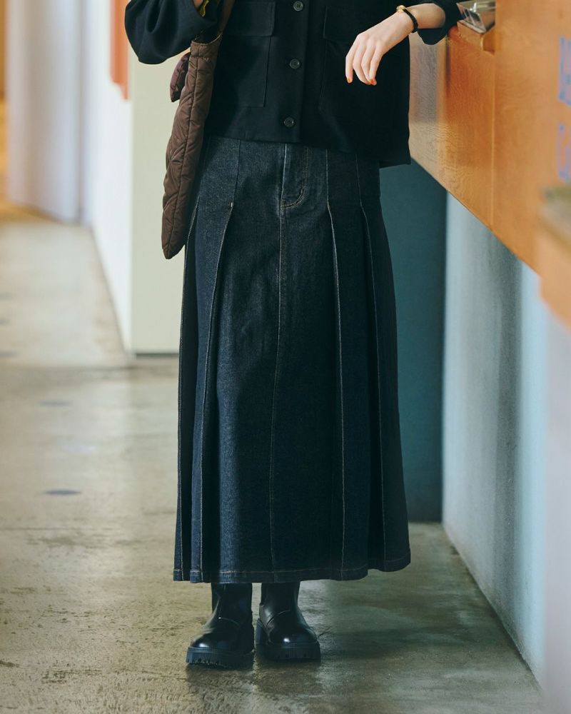 ヨコ糸に伸縮性のある糸を用いたデニムを使用。ほどよい厚みはシルエットが崩れにくく、下着のラインもひびきにくい事など女性にとっても嬉しい点が多い8.5オンスをセレクト。腹部から裾へ施された太い幅のプリーツがポイントです。ミモレ丈でプリーツがゆっくりと揺れる様子はスクール感が薄れ、カラーソックスやローファーを合わせたトラディショナルなスタイルも上品にまとまります。ブラックカラーはモード感があるため、ブーツで足元に重心を置いたスタイルも素敵です。トレンドの短丈アウターとも相性も抜群です。 モデル身長: 166 cm 着用サイズ: 64 サイズ Golden Bear White Label (Ladies') ボトムス (Ladies') 【着用アイテム】468RC450 クルーネックプルオーバー 468RC451 ラッフルパーカ 468RC460 タートルネック 468RC650 シャギーニットプルオーバー 468RC160 ショートジャケット 468RC751 デニムスカート