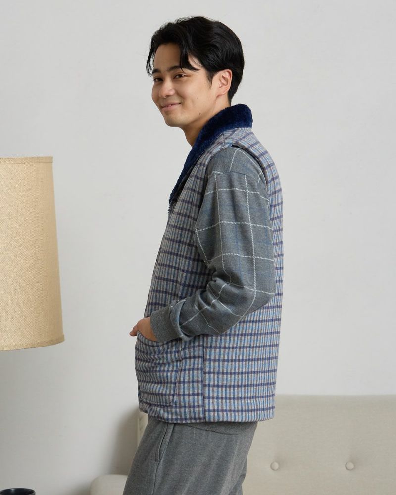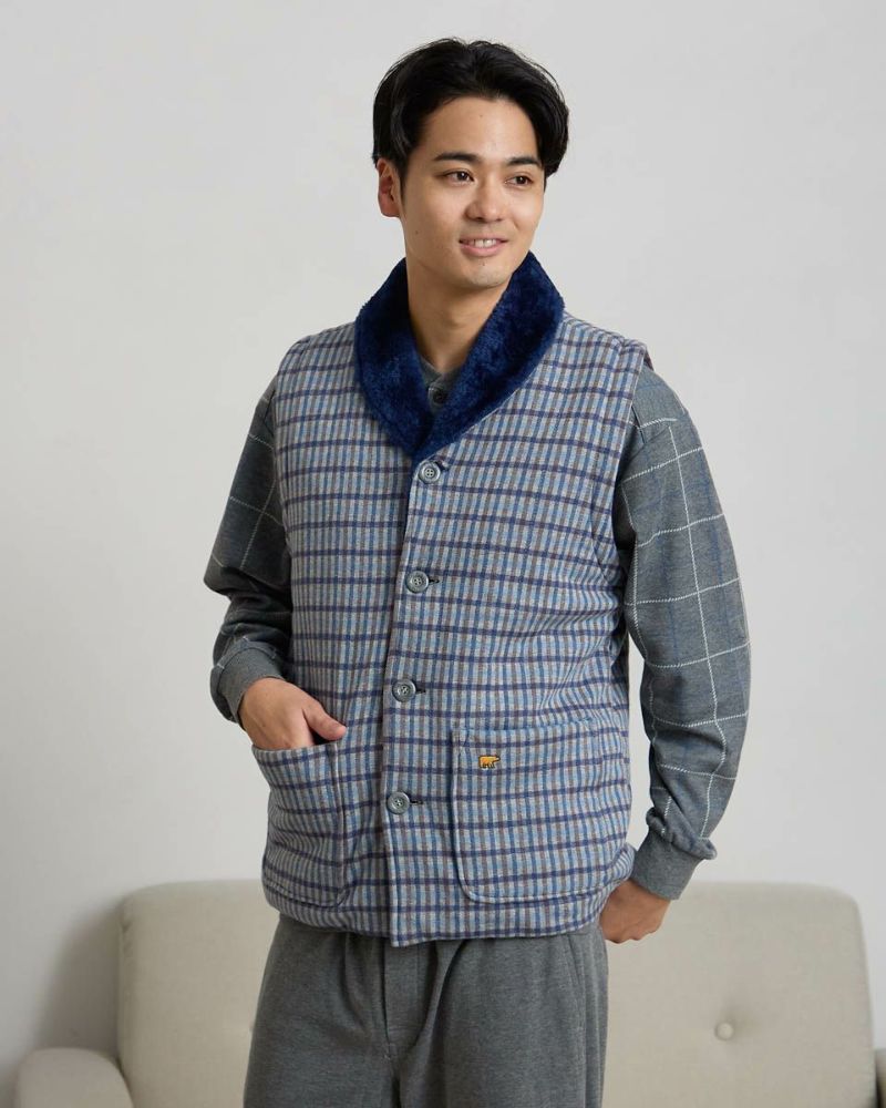チェック柄の中綿入りベストです。柔らかなジャカード素材を使用しました。裏生地は、ボリュームのあるボア素材仕様で、暖かさと着心地の良さがおすすめです。 肌寒い季節に羽織っていただける快適アイテムです。 (品番139QC601と139QC611は同商品です。) モデル身長: 176 cm 着用サイズ: S サイズ Golden Bear Home Wear (Men's パジャマ・肌着類)