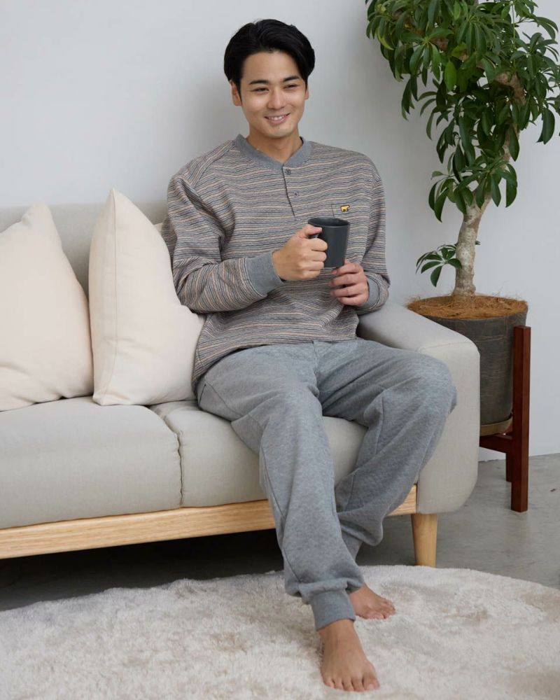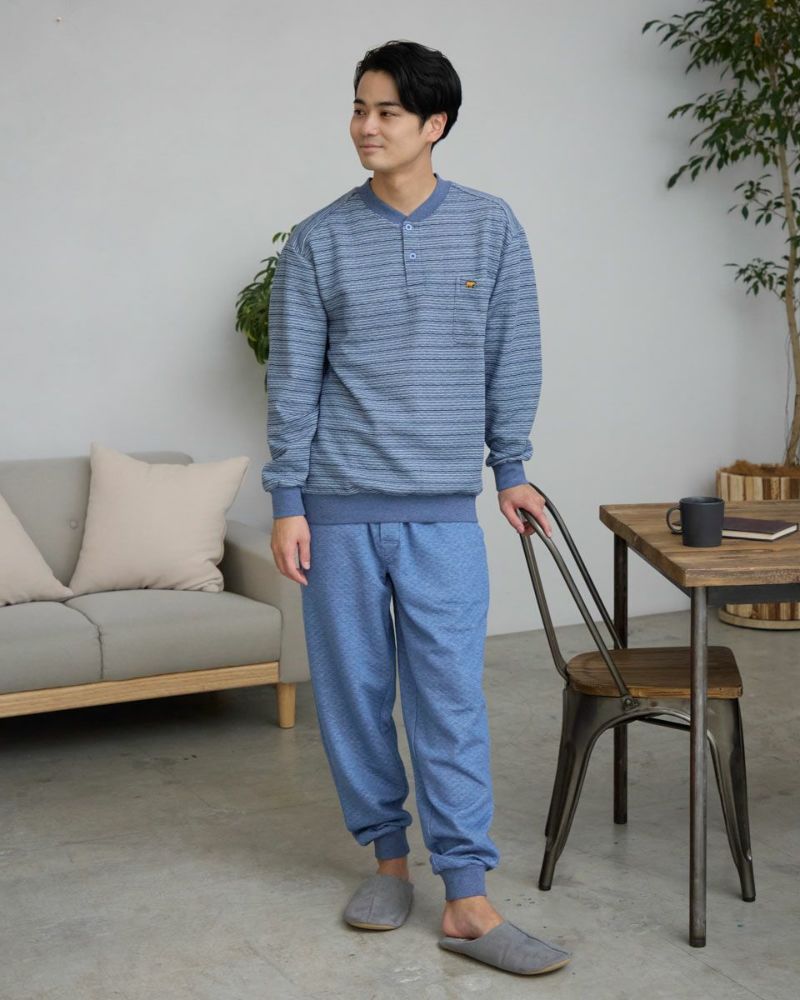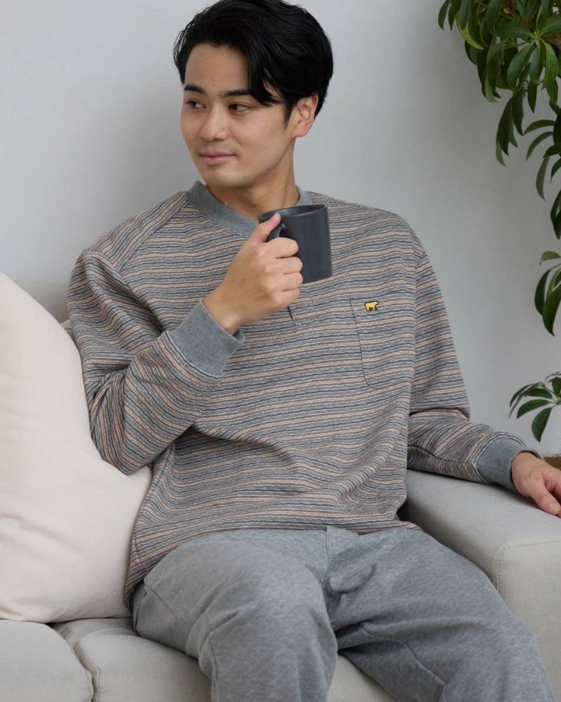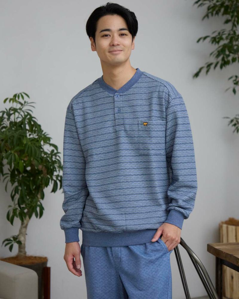 ボーダー柄の長袖・長ズボンのヘンリーネックパジャマです。暖かいキルト素材を使用しました。ゆったりとしたサイズ感で、着心地の良さがおすすめです。