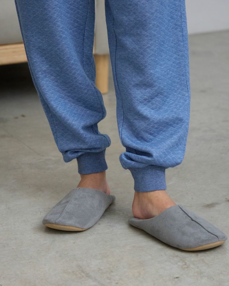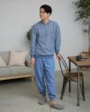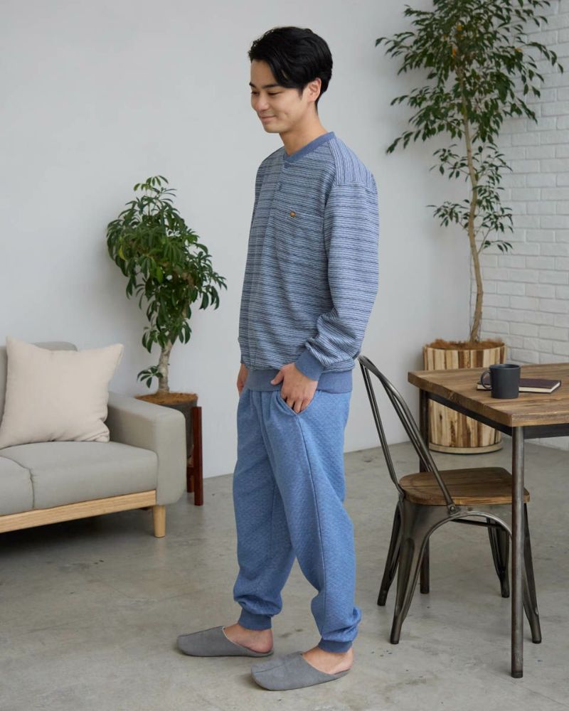 また、ボトムスは前開き・サイドポケットをつけています。ホームウェアとしても使えるこだわりの仕様です。