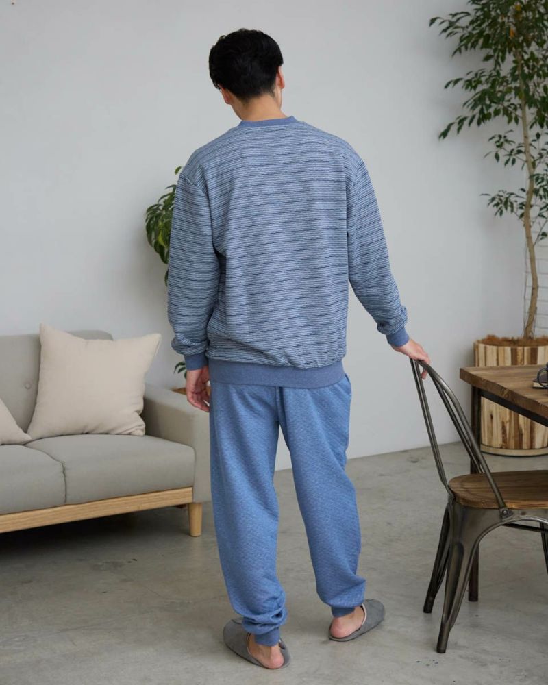 メンズのカットソーパジャマは、トップスの手口・裾口、ボトムスの足口にはリブの絞りを入れており、風が入らず快適な着心地をキープします。後身頃をゆったりと設計し、身頃の切り替え部分を前側にずらすことで、着脱がしやすく寝返りもスムーズに行える「快適仕様」になっています。