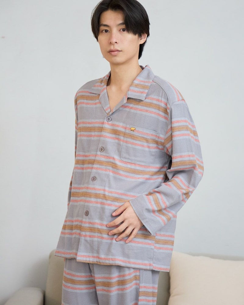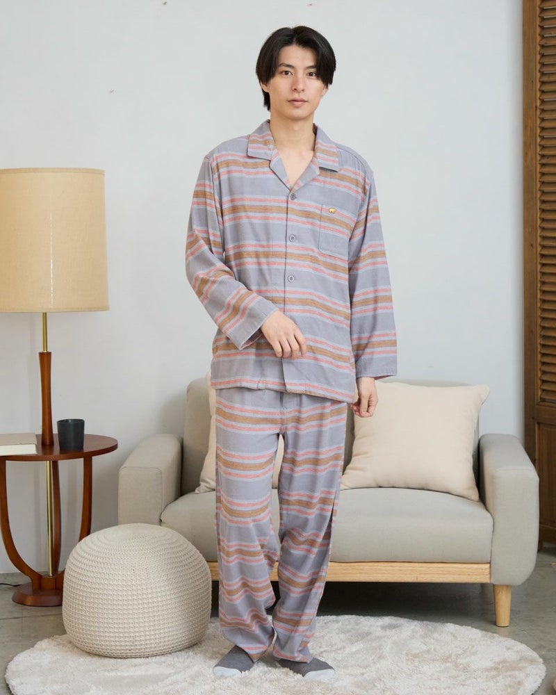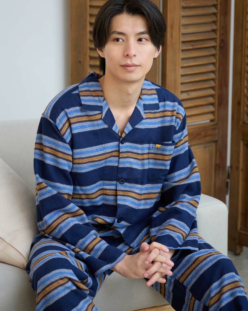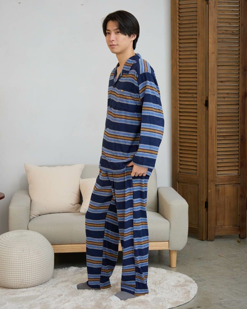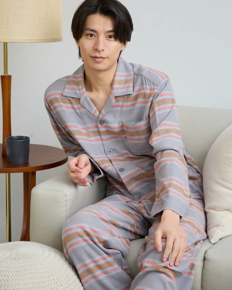 肌寒い季節にぴったりな、ボーダー柄の長袖・長ズボンのテーラードパジャマです。柔らかく滑らかな肌触りが心地よいネル素材を使用し、あたたかみのある風合いに仕上げました。内側には肩部分とお尻部分のみ、軽くて保温性に優れたフリース素材を施し、冷えやすい肩や腰まわりを温めます。シルエットはゆったりとしたリラックス設計で、寝る前のひとときから朝の身支度まで快適な着心地で過ごすことができます。