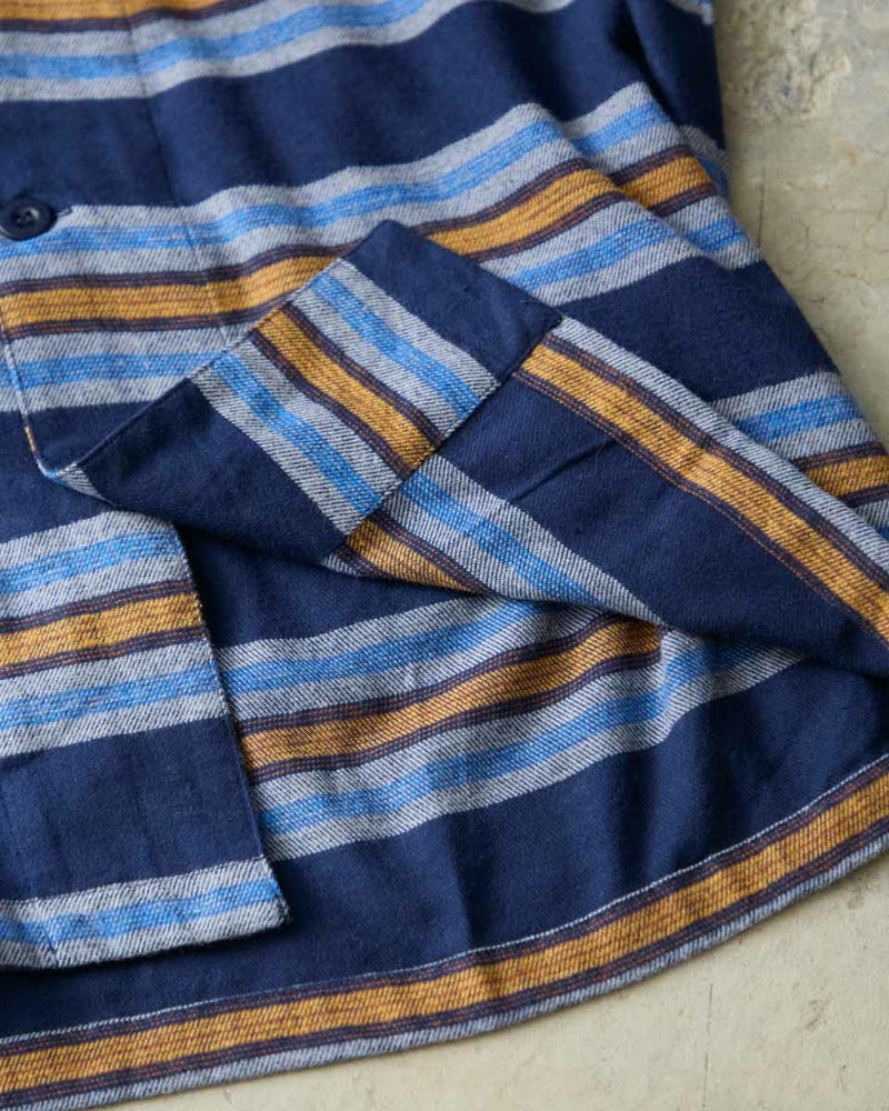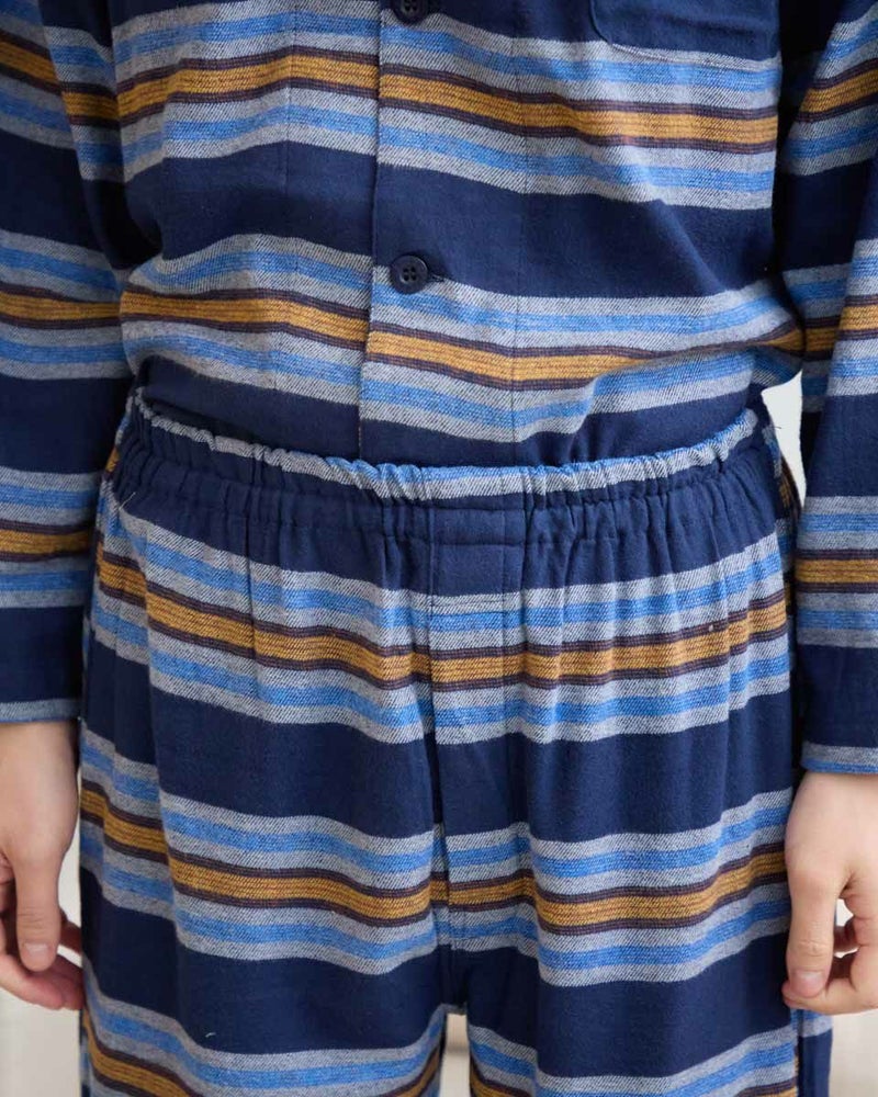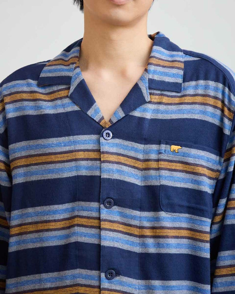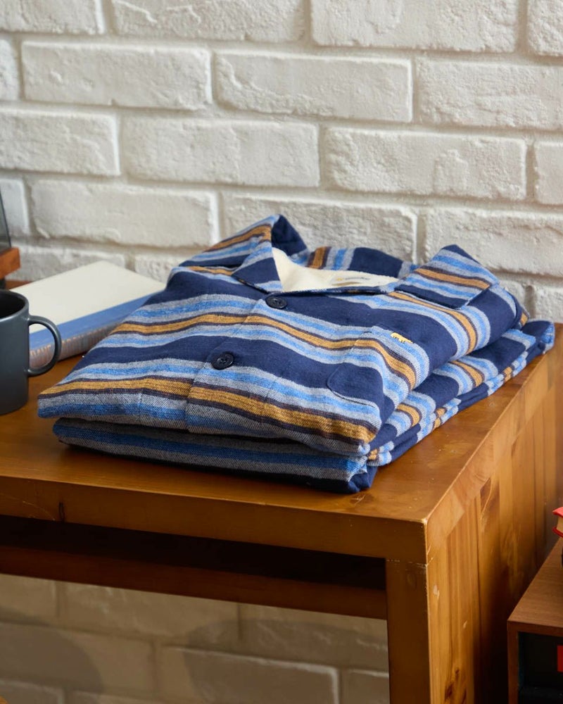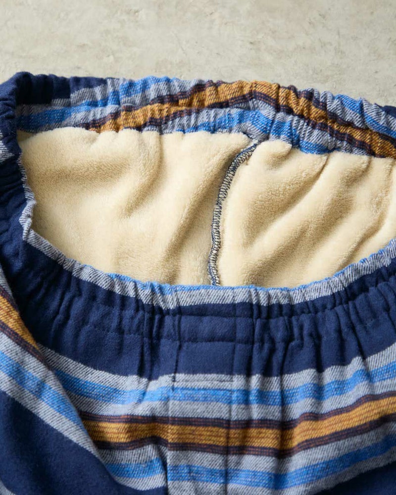 肌寒い季節にぴったりな、ボーダー柄の長袖・長ズボンのテーラードパジャマです。柔らかく滑らかな肌触りが心地よいネル素材を使用し、あたたかみのある風合いに仕上げました。内側には肩部分とお尻部分のみ、軽くて保温性に優れたフリース素材を施し、冷えやすい肩や腰まわりを温めます。シルエットはゆったりとしたリラックス設計で、寝る前のひとときから朝の身支度まで快適な着心地で過ごすことができます。