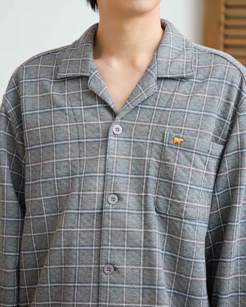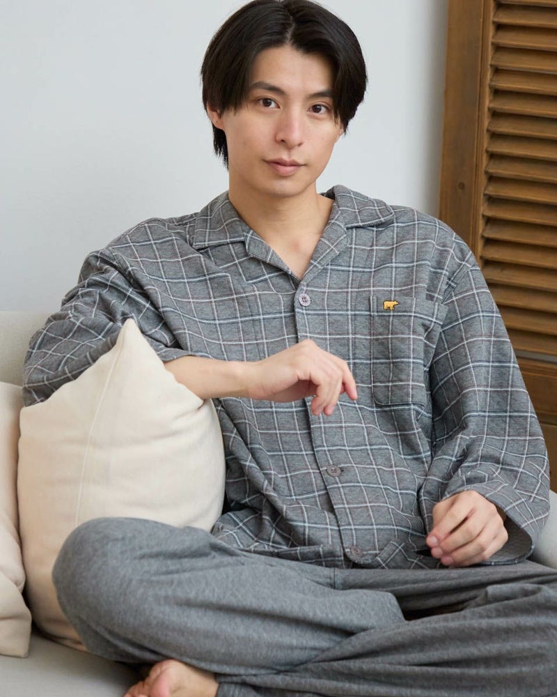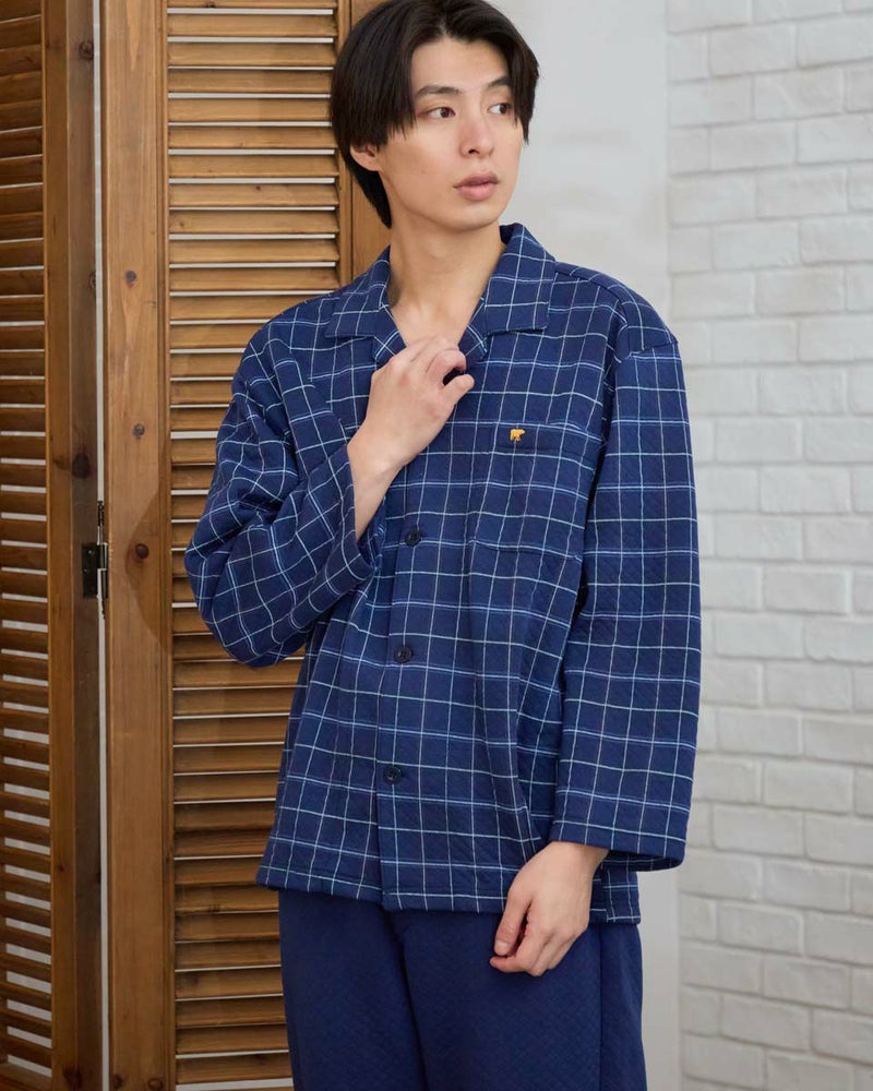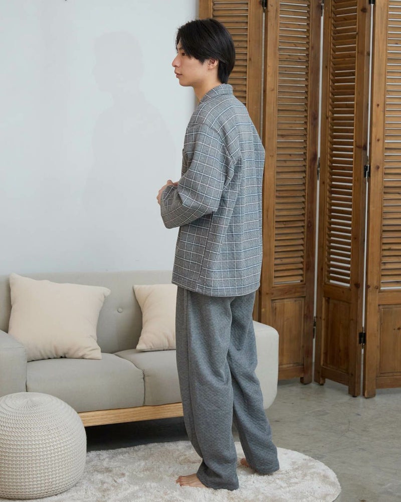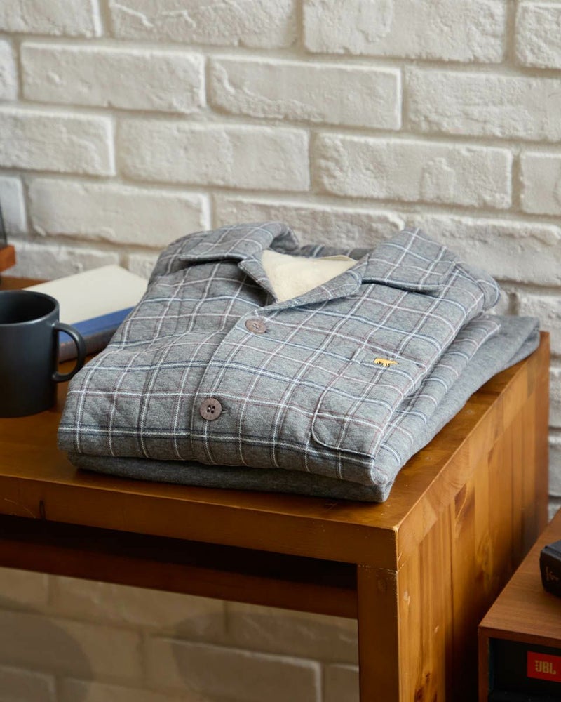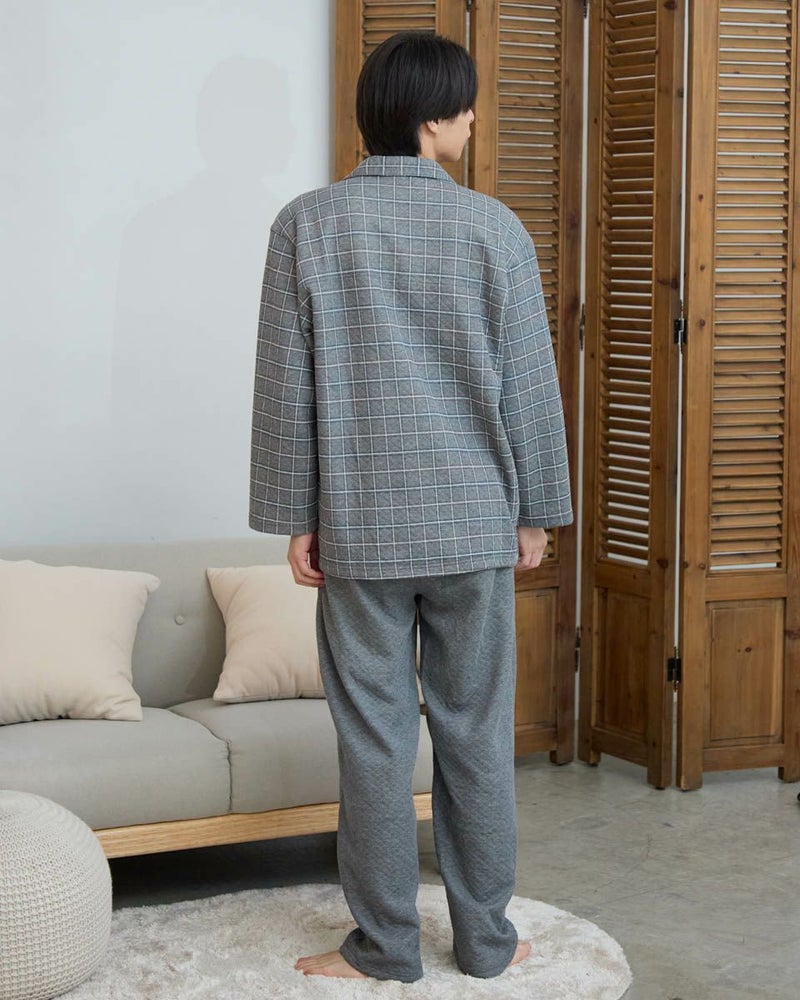 寒さが深まる秋冬に頼れる、長袖・長ズボンのテーラードパジャマです。ほどよい厚みのある素材のうら側には起毛を施し、さらに柔らかく暖かな風合いに仕上げました。内側には肩部分とお尻部分のみ、軽くて保温性に優れたフリース素材を施し、冷えやすい肩や腰まわりを温めます。落ち着いた印象のグレーとネイビーのカラーバリエーションで、おうち時間をよりリラックスした気持ちで過ごせます。