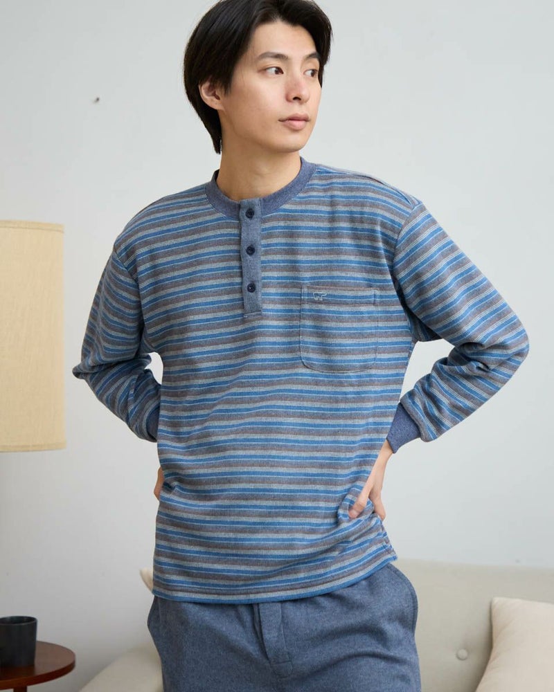 ボーダー柄の長袖・長ズボンのカットソーパジャマです。やわらかな両面起毛の素材は肌触りがよく、寒い季節でもしっかりとしたぬくもりを実感していただけます。内側には肩部分とお尻部分のみ、軽くて保温性に優れたフリース素材を施し、冷えやすい肩や腰まわりを温めます。ゆったりとしたサイズ感で、動きやすさと快適な着心地を両立しました。※パジャマの裾上げ対応は出来ませんのでご了承ください。