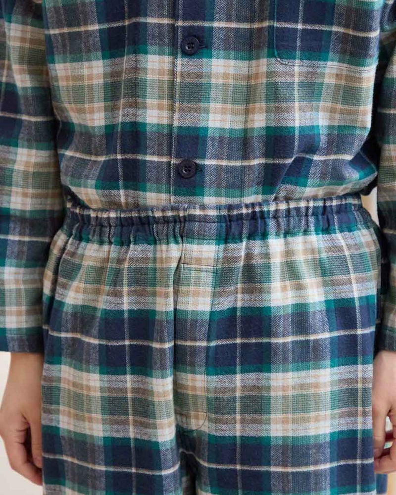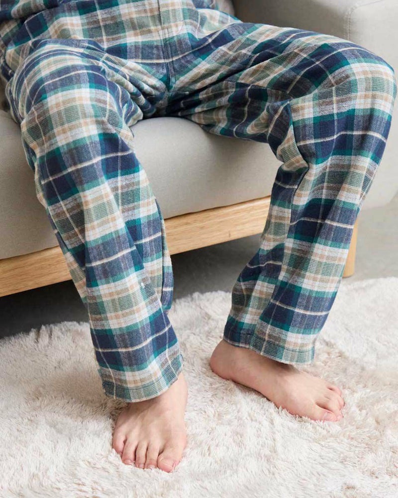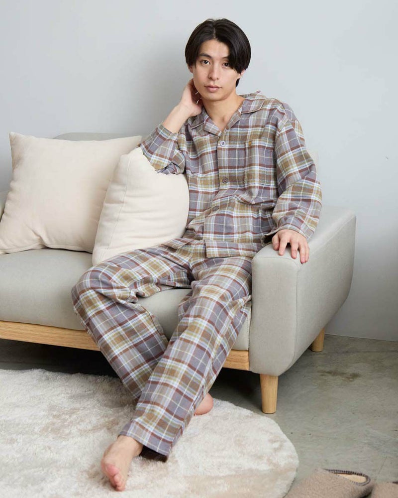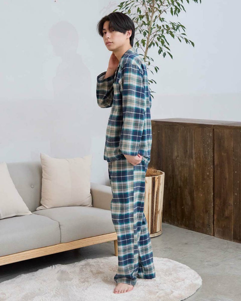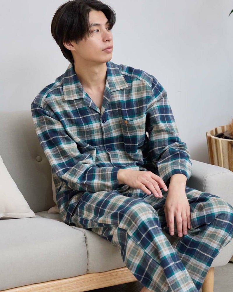 気温が下がりはじめる秋〜冬〜早春まで長く着られる長袖・長ズボンのテーラードパジャマです。暖かい日は1枚でも着られますが、寒い日は薄手の長袖インナーを重ねると暖かさがアップします。暖かく肌触りの良いネル素材を使用しました。ゆったりとしたサイズ感なので、寝返りもしやすく快適で、着心地の良さがおすすめです。