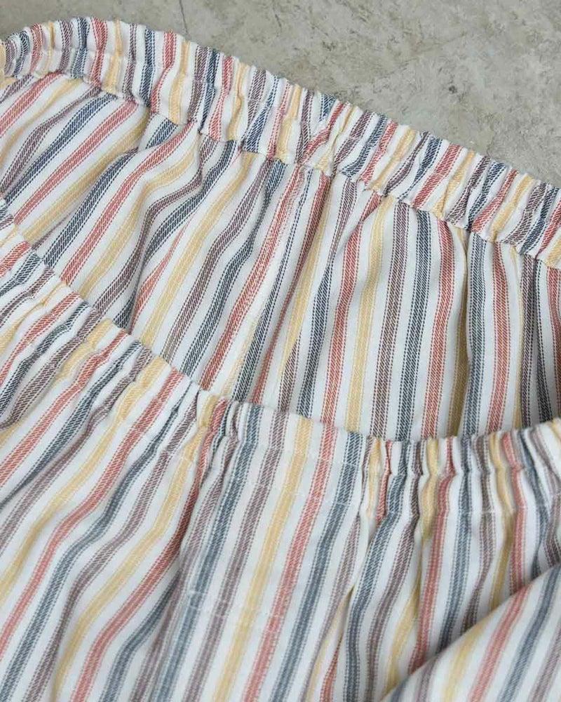 また、ボトムスは前開き仕様で、ヒップラインにゆとりを持ったパターンでゆったりとした着用感になります。ウエストゴムに細いコールゴム2本を採用しているのでソフトなフィット感をお楽しみいただけます。