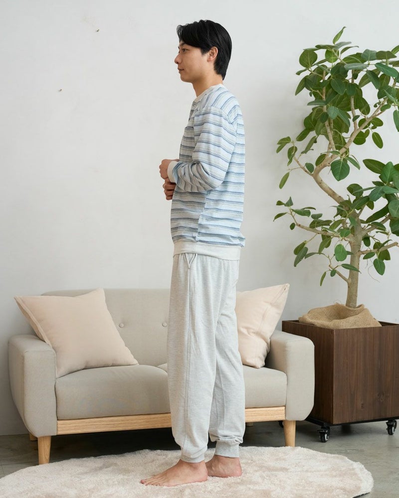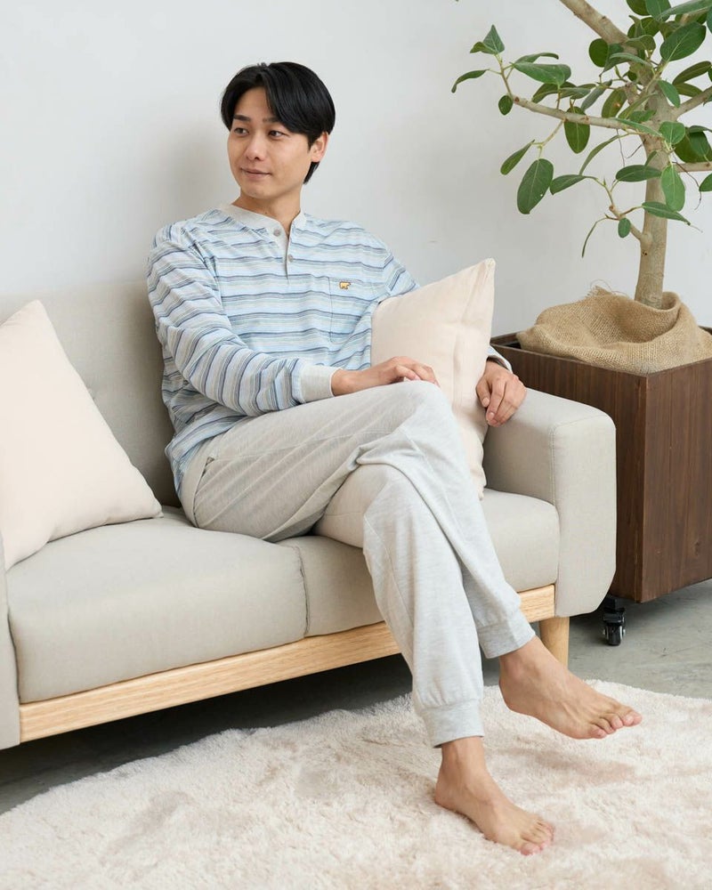 さらっとした風合いが心地よい、長袖のボーダー柄パジャマです。通気性に優れた鹿の子素材をベースにした生地を使用しており、肌離れが良く、汗をかいてもベタつきにくいため快適な着心地を保ちます。軽やかでムレにくく就寝時に最適です。締め付け感の少ない着心地で、リラックスしやすく快適さを重視する方におすすめです。気温の高い季節に向け長い期間着用いただけます。