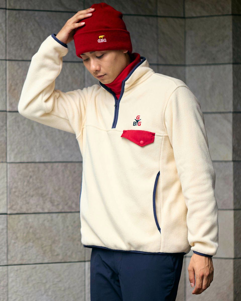 レトロでスポーティなハーフZIPスウェットです。フラップ付きのポケットやパイピング部分に配色を入れアクセントを効かせました。 アウトドアシーンにもオススメです。合わせるインナー・パンツを選ばない、万能アイテムです! モデル身長: 180 cm 着用サイズ: L サイズ GB GOLF カットソー (MEN) 【着用アイテム】 TOURタートルネック (品番: 312QD442 ) GBGスラックス (品番: 312QC703 ) GBGビーニー (品番: 312QD002 ) SPIKEポロシャツ (品番: 312QC452 )
