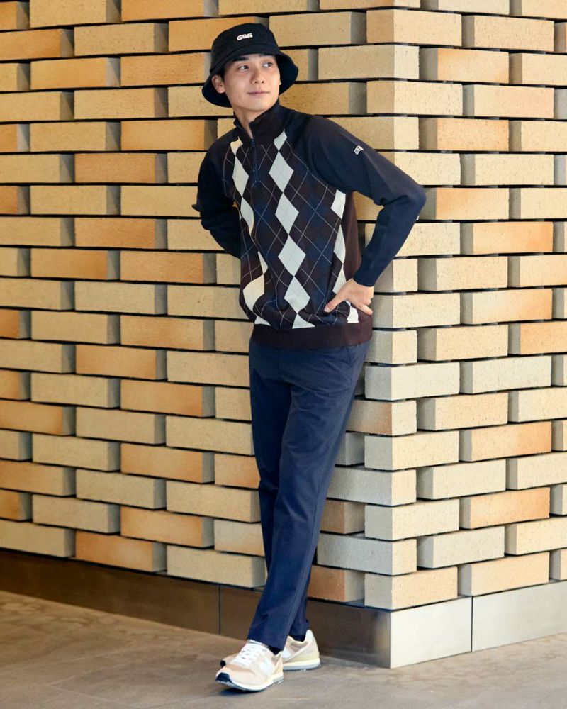 クラシカルなアーガイル柄のハーフZIPニットです。近年ゴルフウェアのニットでは主流となっているポリエステルニット素材を使用しています。なめらかなタッチと、軽さがポイントです。ご家庭で手洗い洗濯が可能で、お手入れラクラク!これ1枚着合わせるだけで、レトロスポーツLOOKが完成!