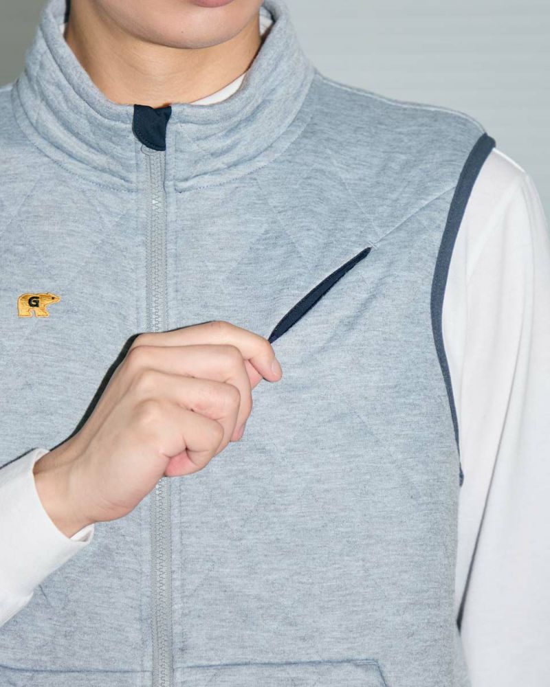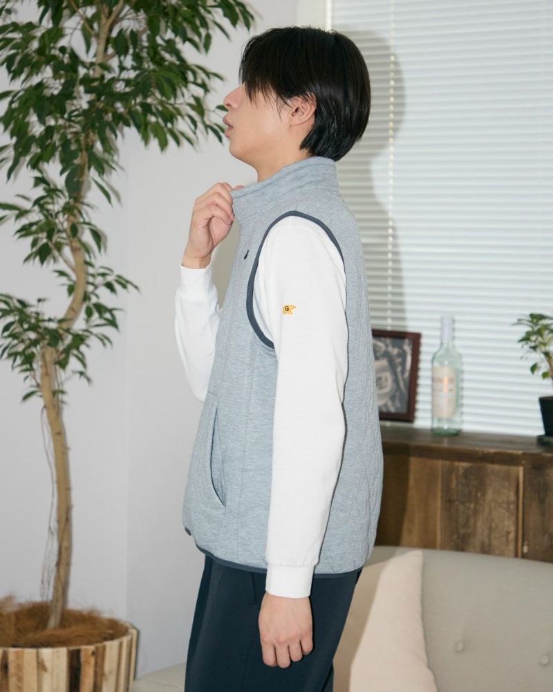 カジュアルな着こなしにも使える薄中綿のキルティングベストです。胸元のポケットはキルティングデザインを生かし、すっきりと仕上げました。もこもこしすぎない厚みなので、秋口はアウターとして、寒くなってきたら、インナーとして長い期間お使いいただけます。