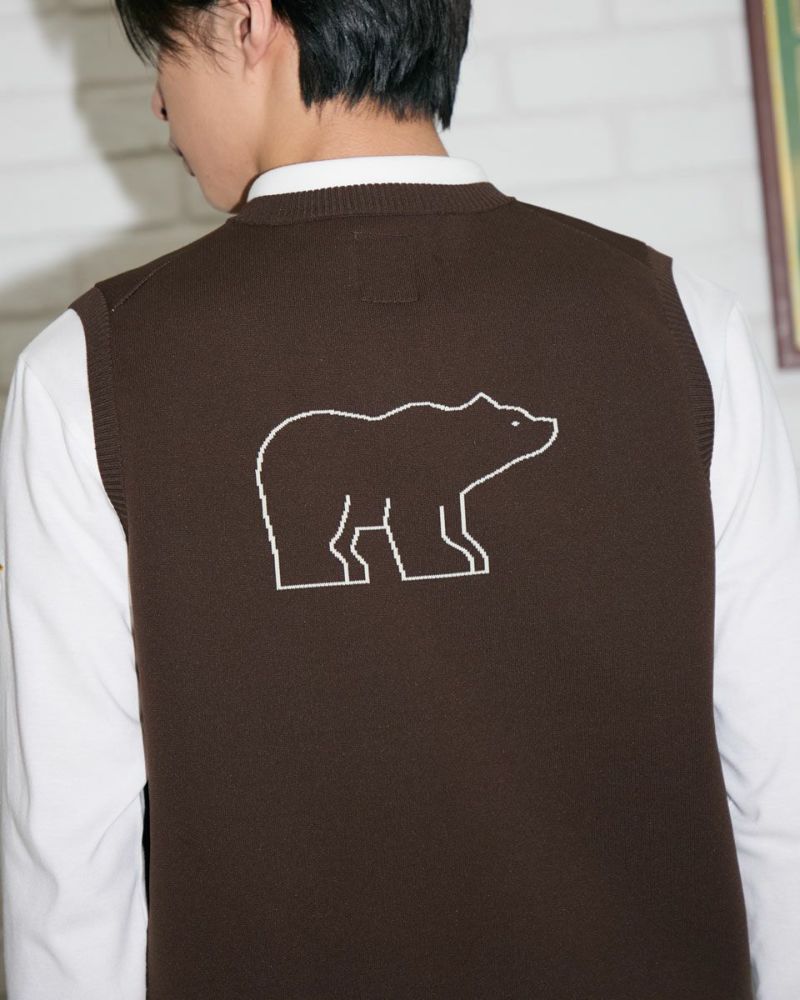 背中に大胆にあしらわれた、大きなクマのロゴが目を引くニットベストです。軽くなめらかな肌触りで、重ね着してもごわつかず、一日中快適に過ごせます。インナーには、シャツやタートルネック、ポロシャツなど、さまざまなアイテムを合わせることで、幅広い着こなしをお楽しみいただけます。ご家庭の洗濯機で洗えるので、お手入れも簡単です。