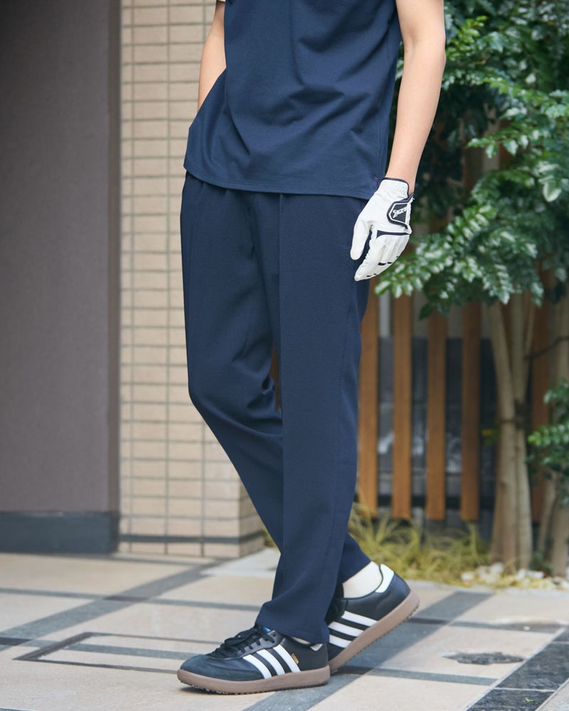 夏の装いを上品かつ快適に仕上げるGBGOLFワンタックイージースラックス。ギンガムサッカー素材特有の凹凸感が肌への接地面を減らし、汗ばむ季節でもサラリとした肌触りを実現。ストレスフリーなはき心地が続きます。ウエストにゆとりをもたせたワンタックデザインは、リラックス感を演出しつつも、上品さを損ないません。縦横に伸びるストレッチ素材は、ゴルフでのアクティブな動きから普段使いまで、あらゆるシーンで快適にフィット。休日のゴルフや、カジュアルなビジネスシーンにも最適です。