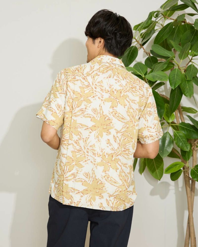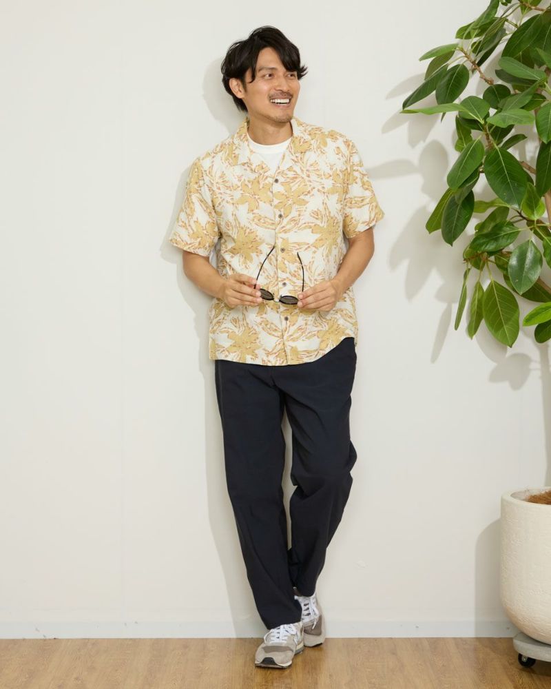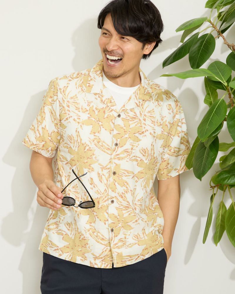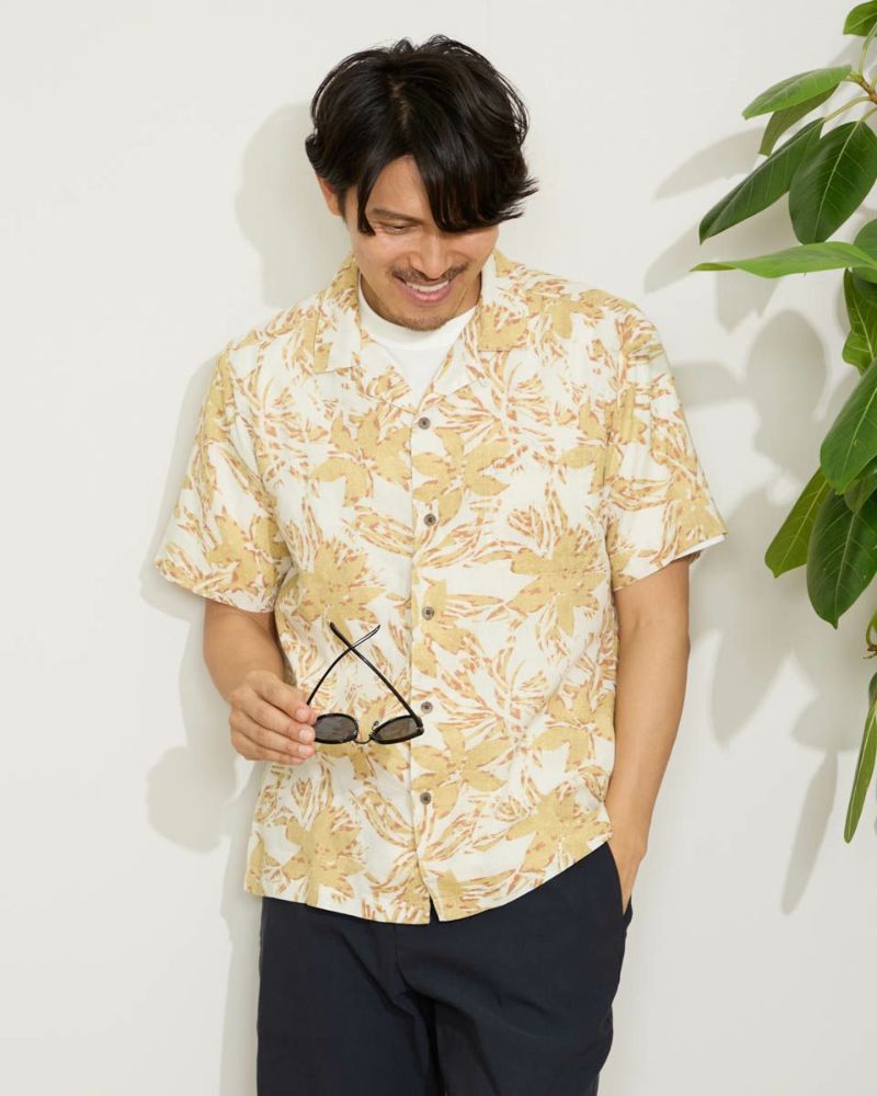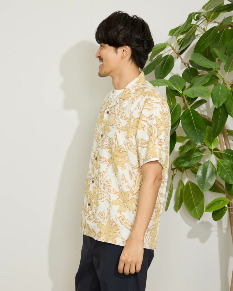 大柄のボタニカルプリントを施したオープンカラーシャツです。涼感のある綿麻混素材を使用しています。色柄をナチュラルな印象に仕上げ、大人のリゾートスタイルを演出してくれます。 モデル身長: 180 cm 着用サイズ: L サイズ Golden Bear Men's シャツ (Men's) 【着用アイテム】314Q3534 GB天竺Tシャツ 314Q5535 ロゴTシャツ 314Q5701 イージーパンツ 314Q4701 イージーアンクルパンツ