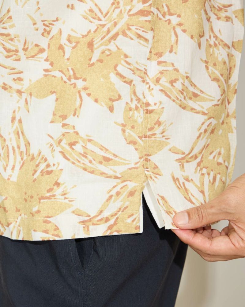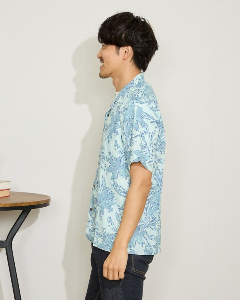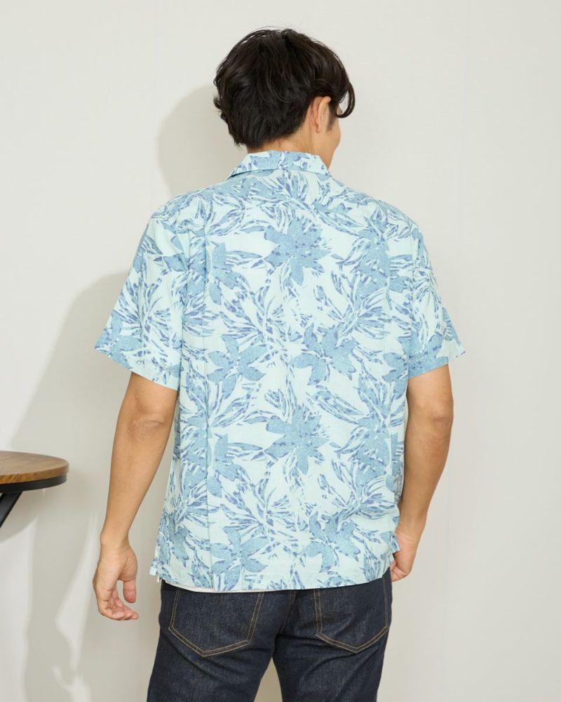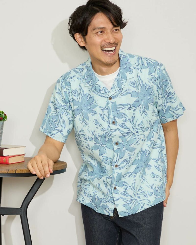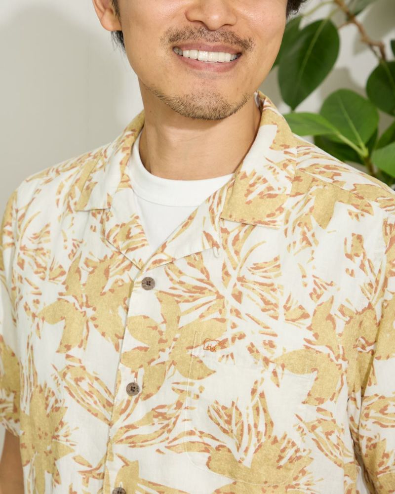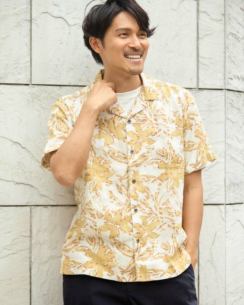 大柄のボタニカルプリントを施したオープンカラーシャツです。涼感のある綿麻混素材を使用しています。色柄をナチュラルな印象に仕上げ、大人のリゾートスタイルを演出してくれます。 モデル身長: 180 cm 着用サイズ: L サイズ Golden Bear Men's シャツ (Men's) 【着用アイテム】314Q3534 GB天竺Tシャツ 314Q5535 ロゴTシャツ 314Q5701 イージーパンツ 314Q4701 イージーアンクルパンツ