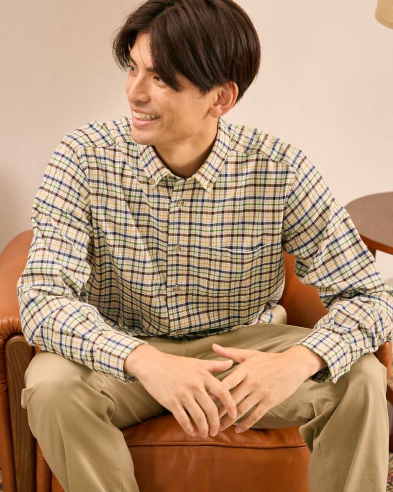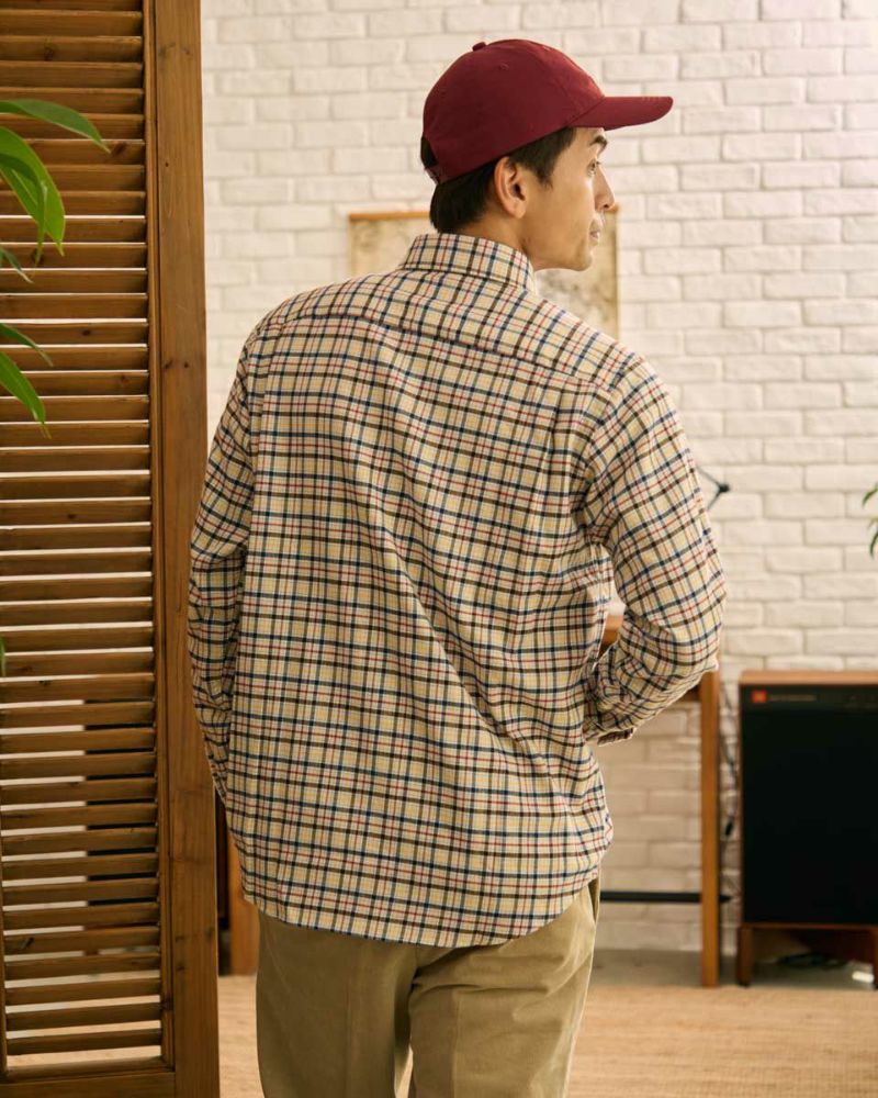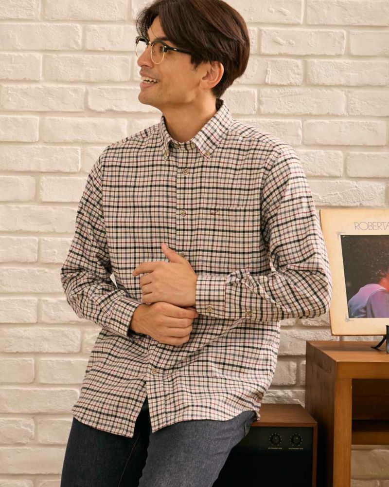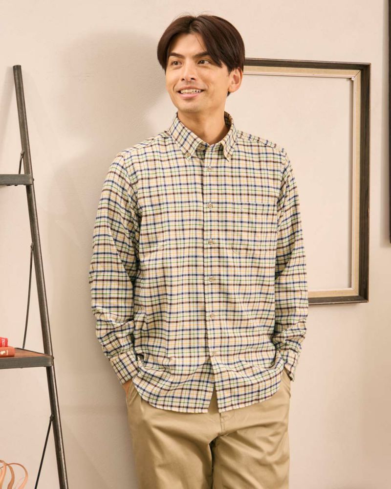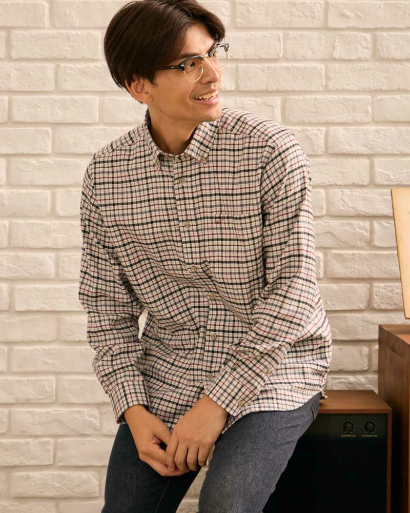 着合わせしやすい白場チェックのボタンダウン襟シャツです。微起毛を施した生地は、柔らかくしっとりとした肌触りが特徴です。ポリエステル混で乾きやすさも魅力です。コーディネートのアクセントになるシャツです。