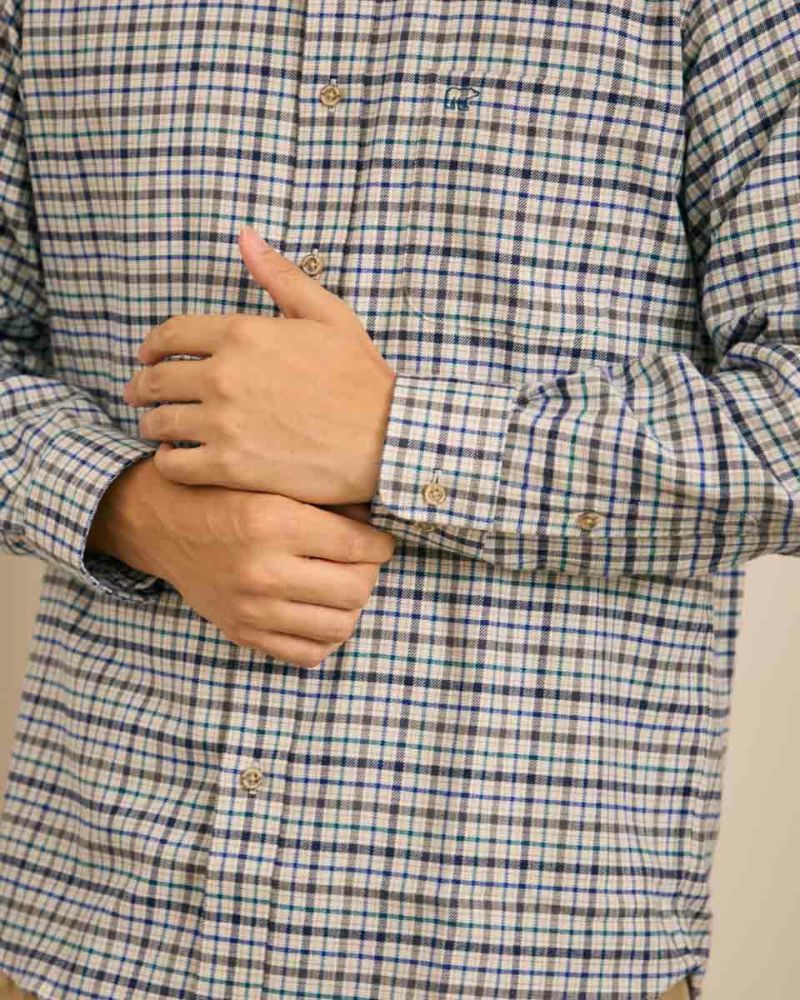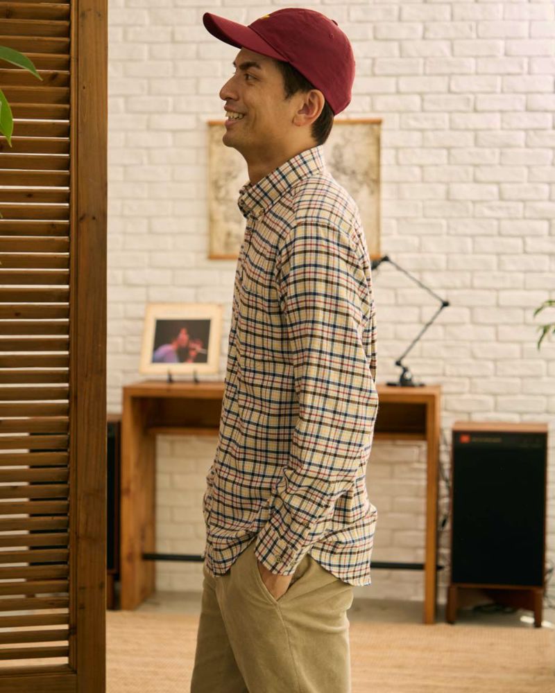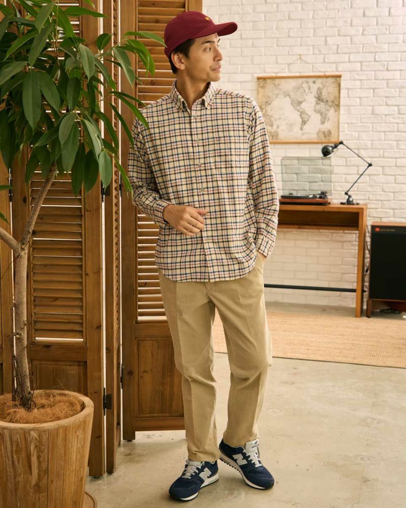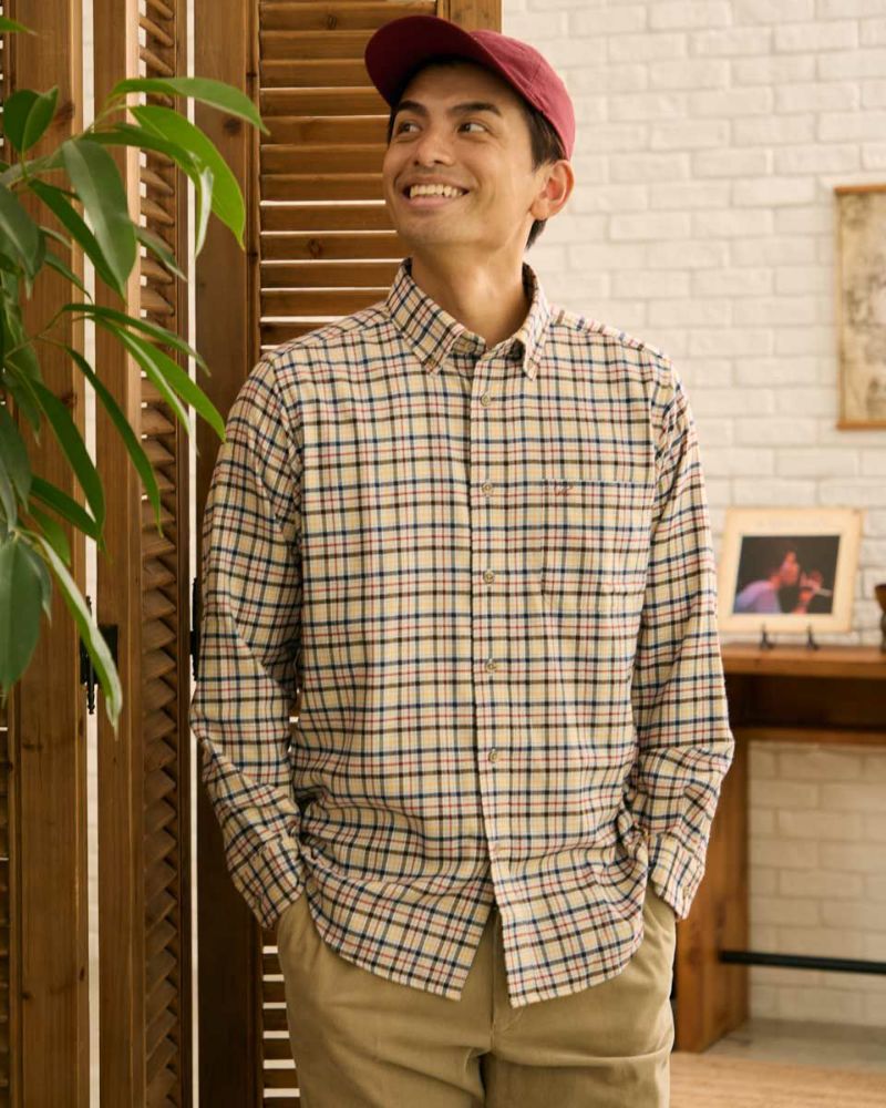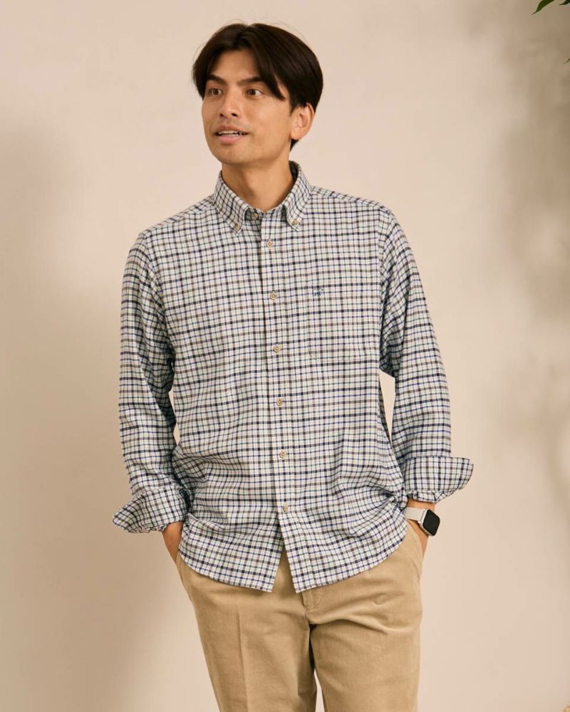 着合わせしやすい白場チェックのボタンダウン襟シャツです。微起毛を施した生地は、柔らかくしっとりとした肌触りが特徴です。ポリエステル混で乾きやすさも魅力です。コーディネートのアクセントになるシャツです。