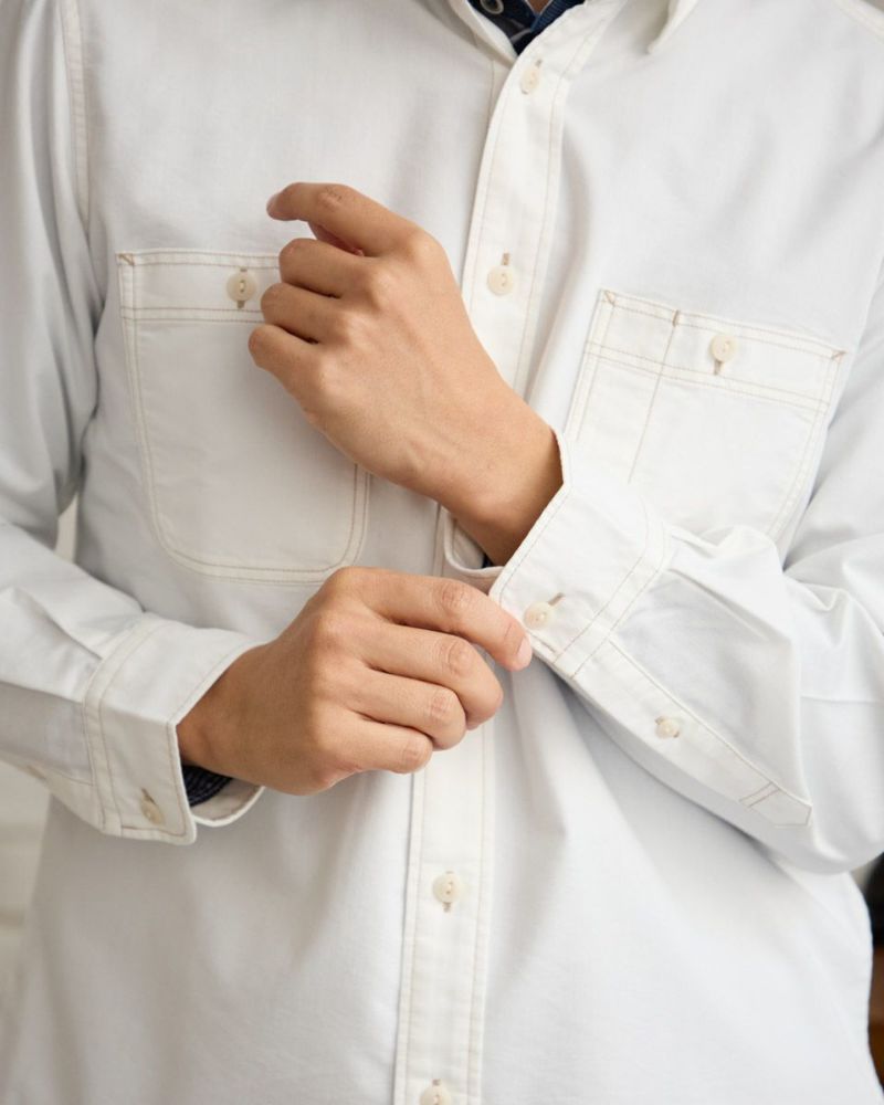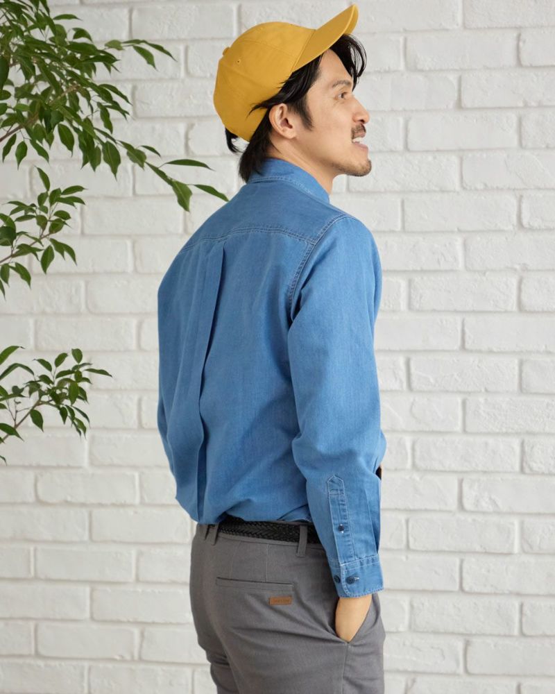 着回しやすいレギュラー襟シャツです。ライトオンスのデニム生地を使用しています。薄手で軽く、やわらかな肌触りが特徴です。製品洗いを施し表情のある風合いに仕上げました。インディゴ染めの為、洗うたびに風合いの変化をお楽しみいただけます。 モデル身長: 180 cm 着用サイズ: L サイズ Golden Bear Men's シャツ (Men's) レディースサイズはこちら 家族コーディネートアイテムはこちら