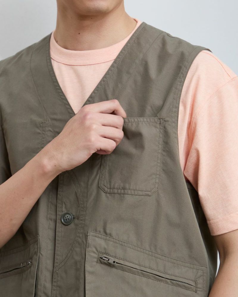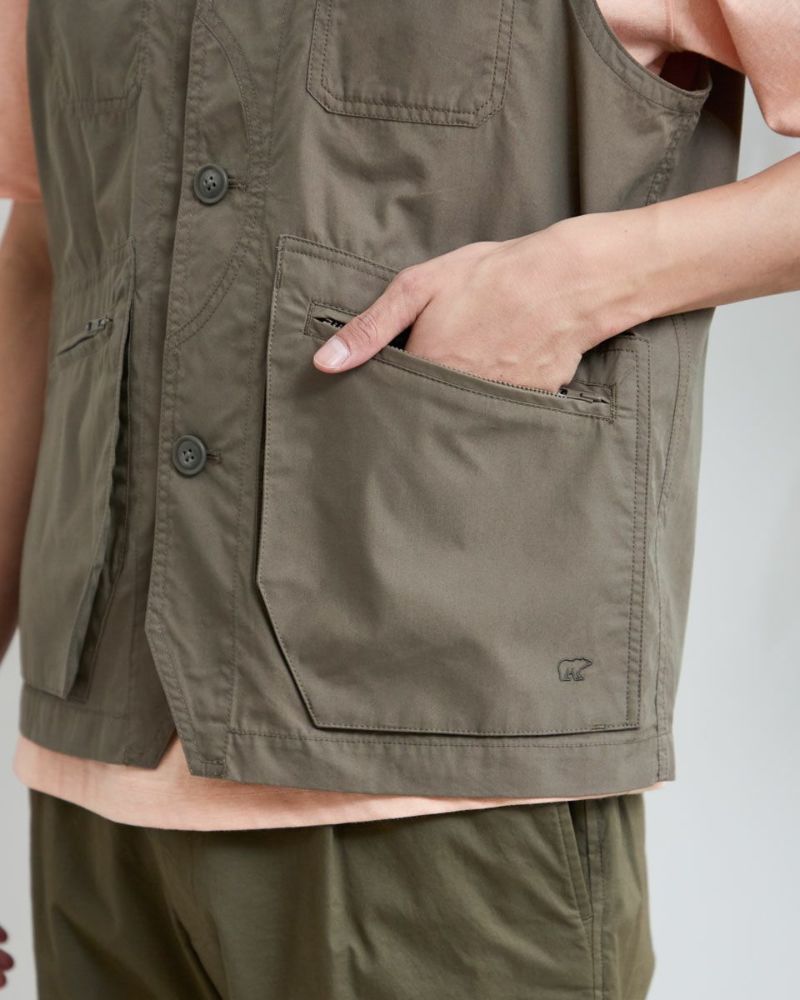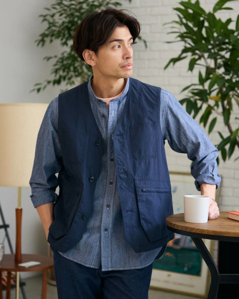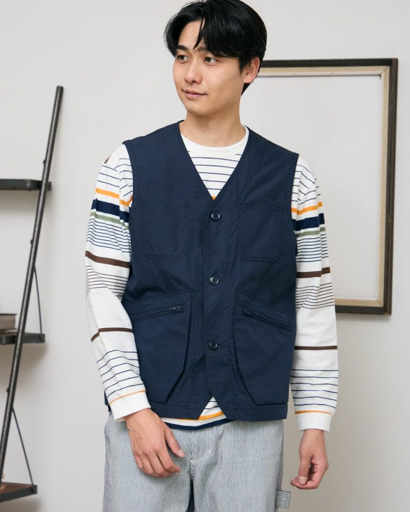 ハンティングベストをモチーフにしたアウターベストです。綿/ナイロン素材を使用し、シャツやTシャツとのレイヤードスタイルをお楽しみいただけます。ご家庭でのお洗濯(手洗い)が可能です。