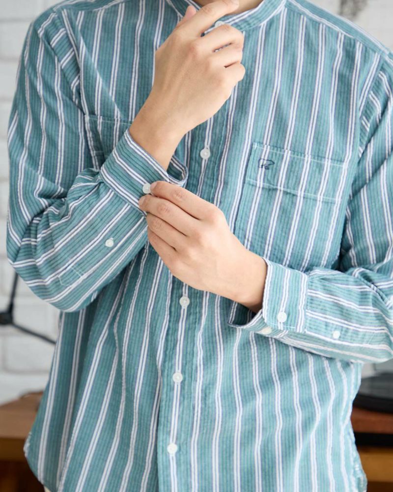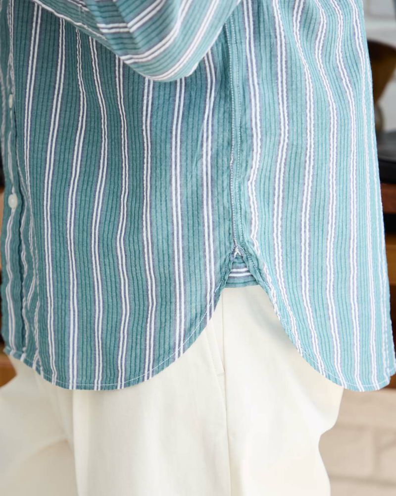 マルチストライプのバンドカラーシャツです。サッカー組織を入れ、さらっとした着心地に仕上げました。胸にはダブルポケットがありオーバーシャツとしても活躍するシャツです。