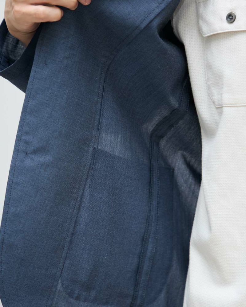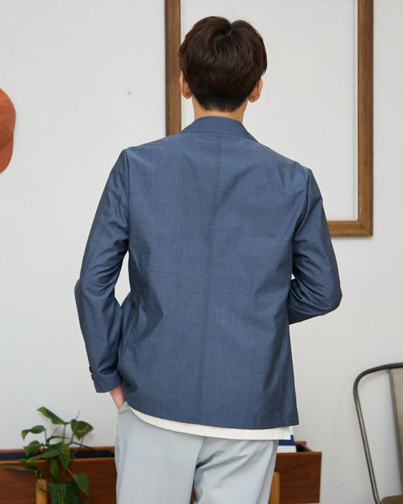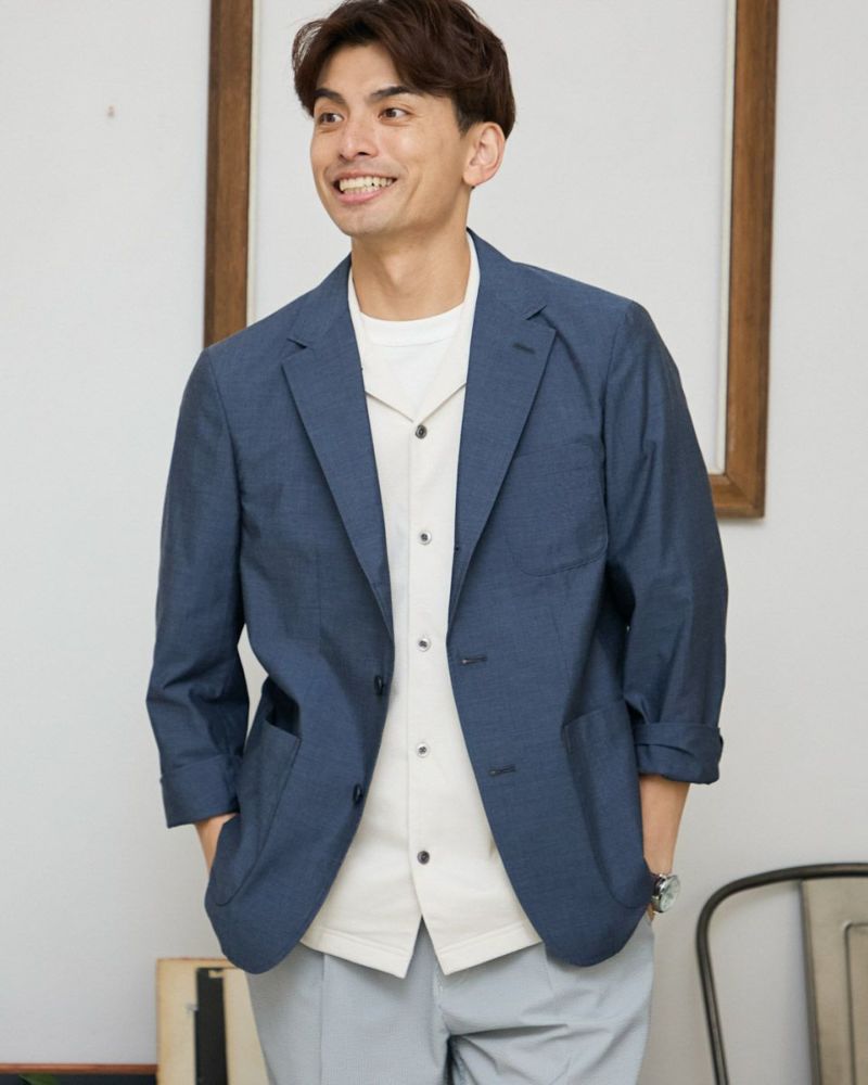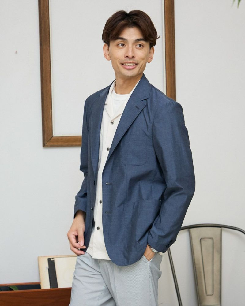 涼感のあるシャンブレー生地を使用したジャケットです。シャツ感覚で羽織れる軽さが特徴です。合わせるインナーによって様々なコーディネートをお楽しみいただけます。ご家庭でのお洗濯(手洗い)が可能で、長い期間ご着用いただけます。