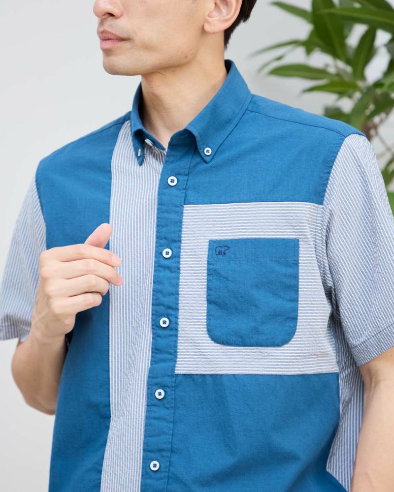 異なる生地を切替えたボタンダウン襟の半袖シャツです。 無地とストライプサッカー生地を切替え、表情のある雰囲気に仕上げました。 年齢問わずすっきりしたカジュアルスタイルを演出します。 モデル身長: 180 cm 着用サイズ: L サイズ Golden Bear Men's シャツ (Men's) 同デザイン大きい(3L,4Lサイズ)はこちら 【着用アイテム】314R5701 スラックス