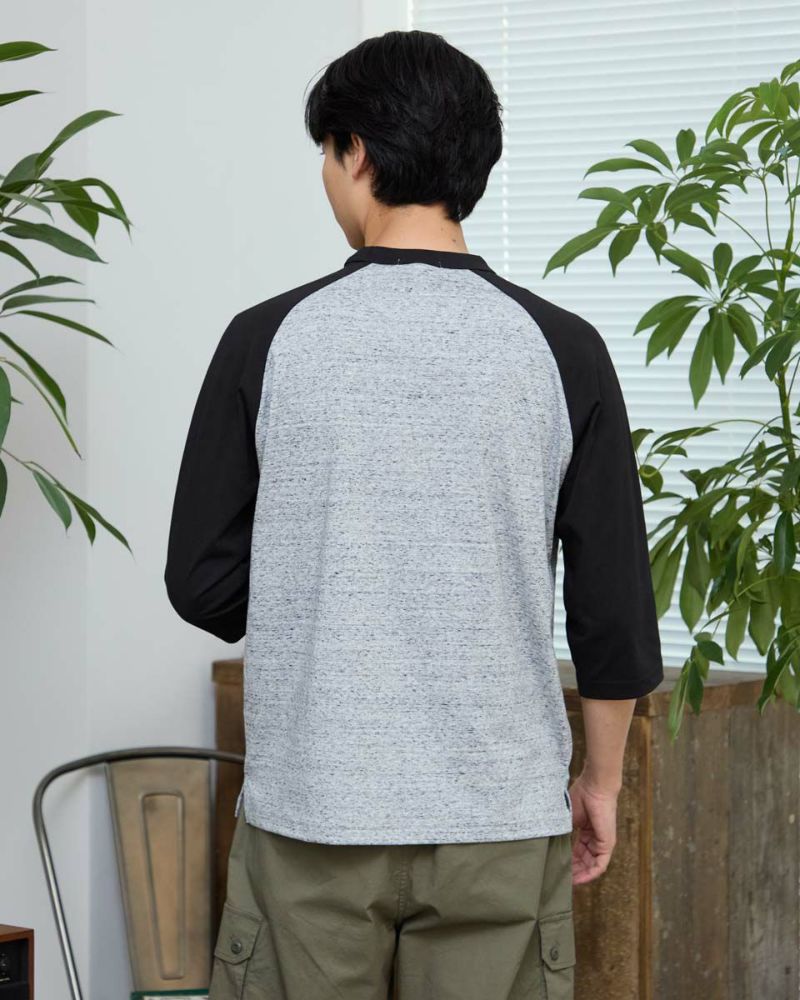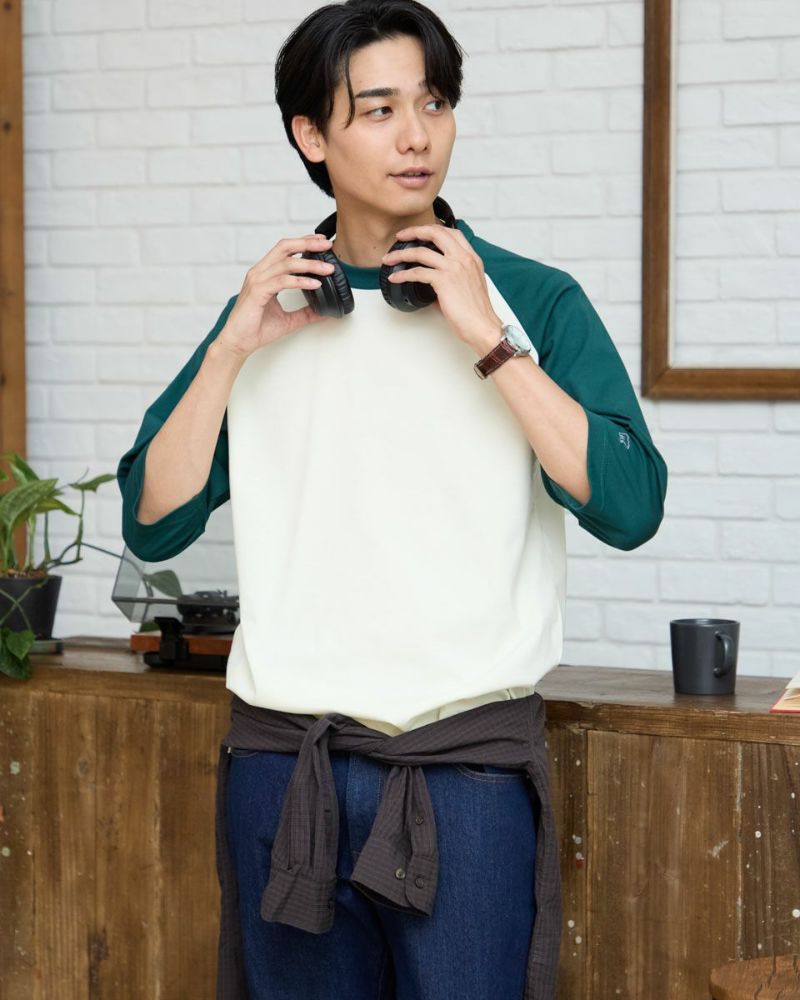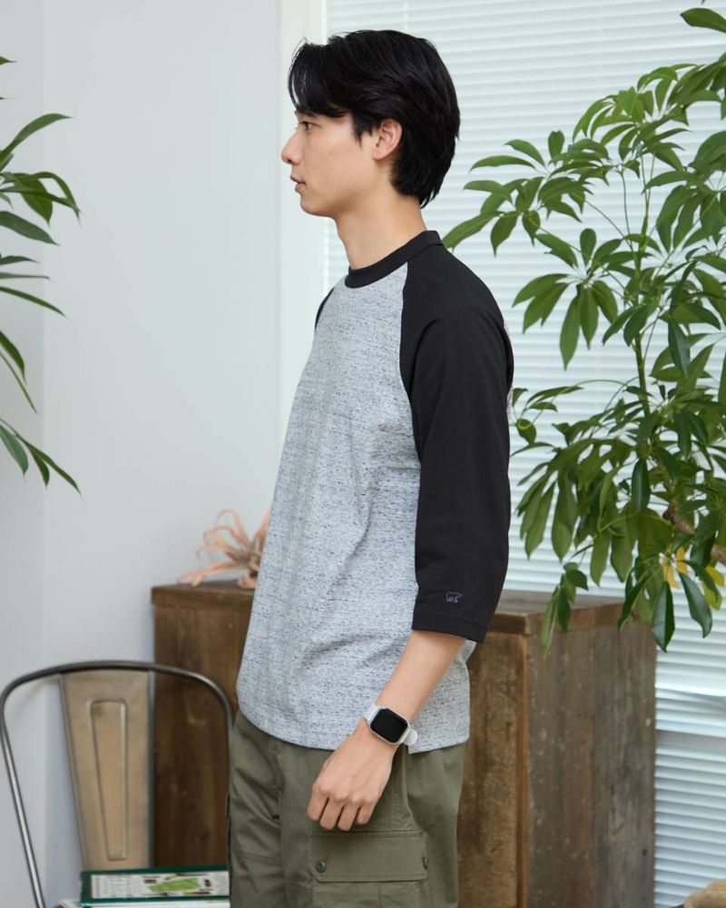 七分袖のベースボールTシャツです。滑らかな肌触りが特徴のプレーティング天竺を使用しています。ラグランスリーブ仕様のカラー切替がポイントです。 モデル身長: 180 cm 着用サイズ: L サイズ Golden Bear Men's カットソー (Men's) 【着用アイテム】314R7701 カーゴハーフパンツ 314R8212 バンドカラーシャツ 314R8702 デニム