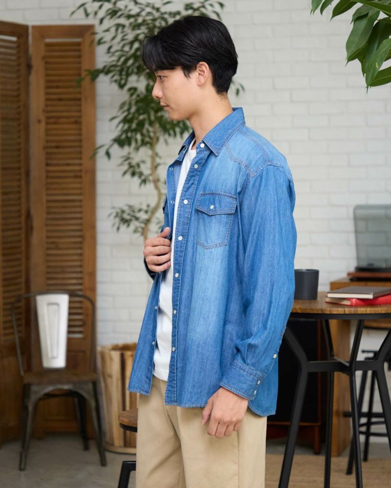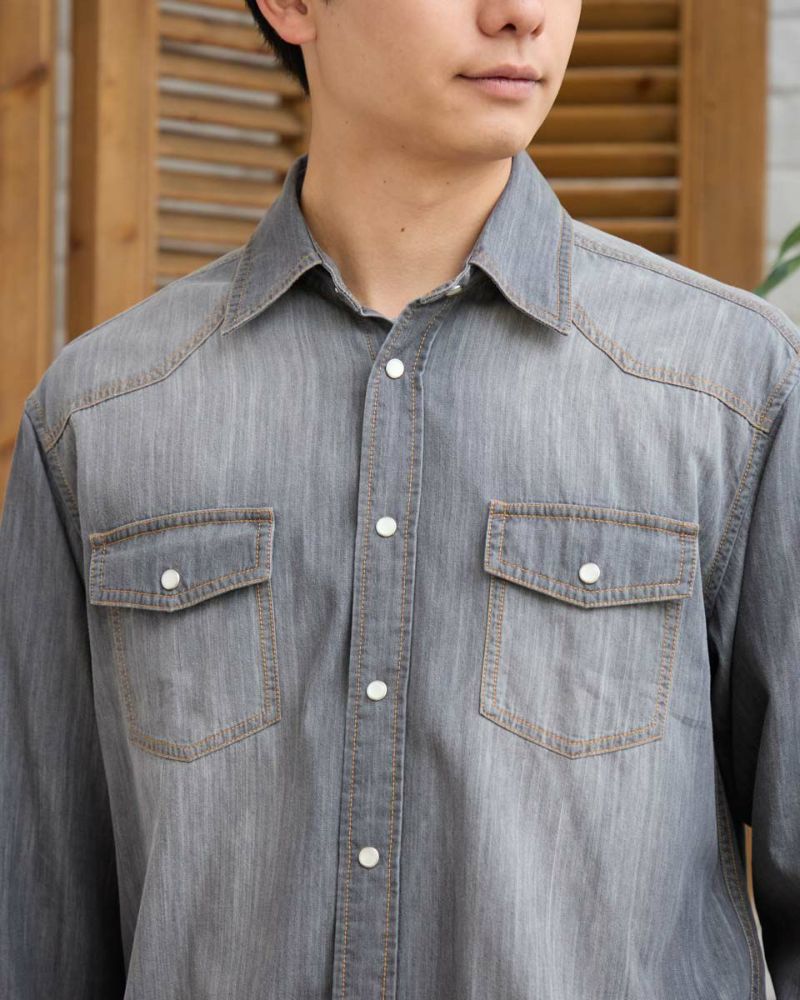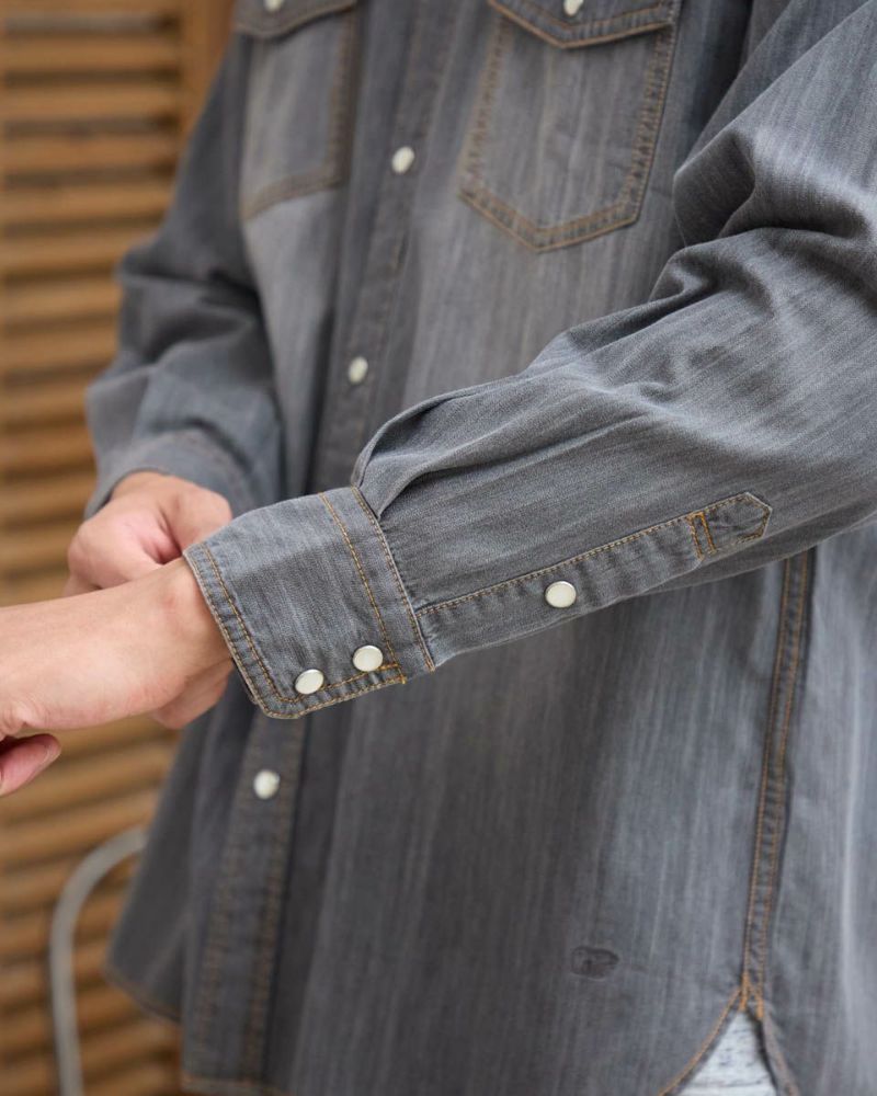 洗い加工と研磨加工(サンドブラスト)で色落ち感のある無骨さを表現したウエスタンシャツです。サンドブラストは高圧で砂を吹きつけ生地表面を削り、ヴィンテージ感を出す手法です。デニムやチノに合わせた王道スタイルはもちろん、ジャケットやスラックスでキレイめなスタイリングやバンダナ等の小物で遊びをプラスするのもおすすめです。 モデル身長: 180 cm 着用サイズ: L サイズ Golden Bear Men's シャツ (Men's) 【着用アイテム】314RC430 GB天竺長袖Tシャツ 314RC700 ワイドチノ 314RC704 イージーパンツ