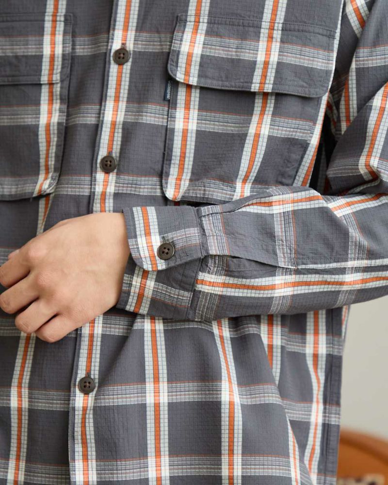 リップストップのような格子地柄が入ったオープンカラーシャツです。心地よいハリ感と色合いがスポーティーな印象を与える大柄チェックです。ややゆったりとしたサイズ感です。Tシャツの上に羽織るカジュアルスタイルがおすすめです。実用性とデザイン性を兼ね備えた大きめのマチ付きフラップポケットがポイントです。 モデル身長: 180 cm 着用サイズ: L サイズ Golden Bear Men's シャツ (Men's) 【着用アイテム】314RC003 ウォッシュキャップ 314RC414 ハーフZIPスウェット 314RC704 イージーパンツ