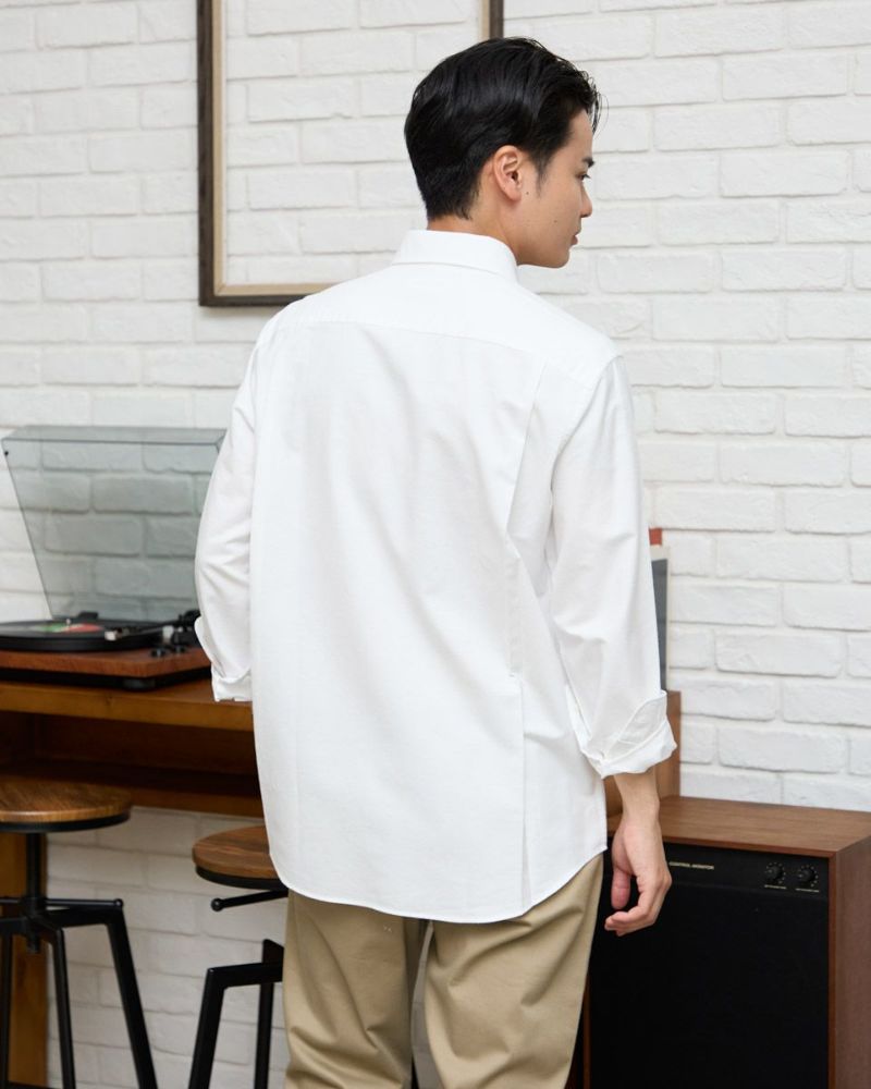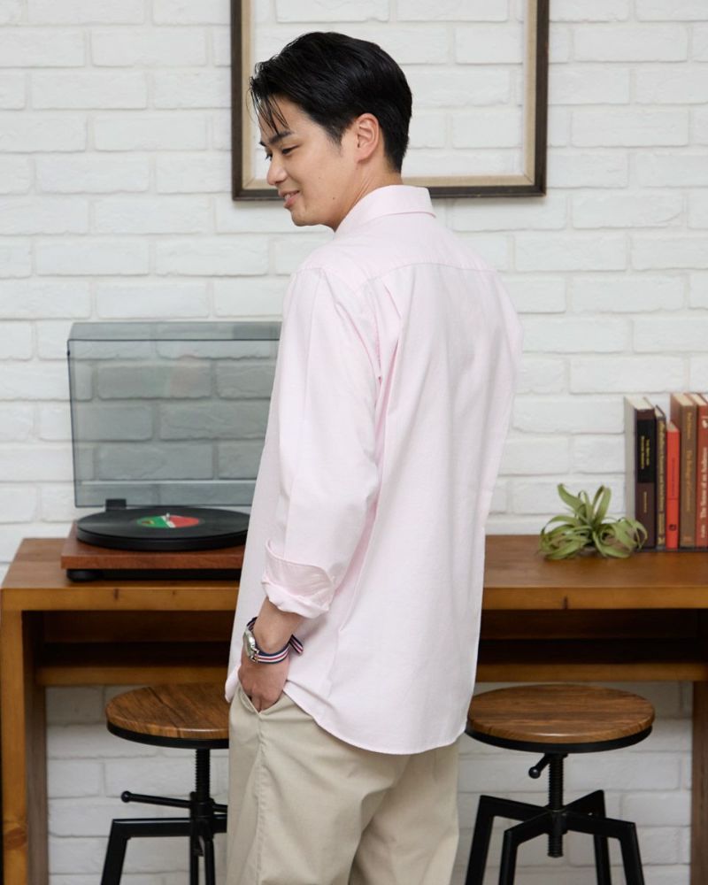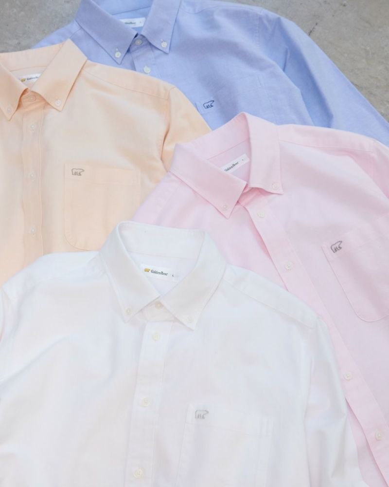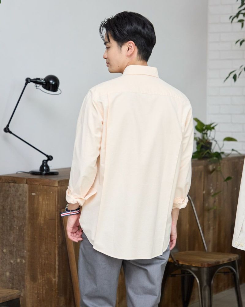 ボタンダウン襟のオックスシャツです。生地は緯糸に太番手を使用し肉感があり、表面にピーチ起毛をかけ製品柔軟洗いをかけることでふっくらとした柔らかな風合いに仕上げました。お洗濯後のアイロンがけが大変・・・なんてこと、ありますよね?イージー加工を施していますのでお手入れが簡単です。ホワイト、ピンク、クリーム、サックスのカラーバリエーション。迷ったらこれ!と言える万能アイテムです。一枚持っているだけで、毎日のコーディネートがぐっと楽になります。 モデル身長: 176 cm 着用サイズ: L サイズ Golden Bear Men's シャツ (Men's) レディースサイズはこちら 【着用アイテム】317RC101 ブレザー 314RC412 ラガーシャツ 314R8452 長袖ポロシャツ 314R8701 チノパン 314R8703 イージーパンツ