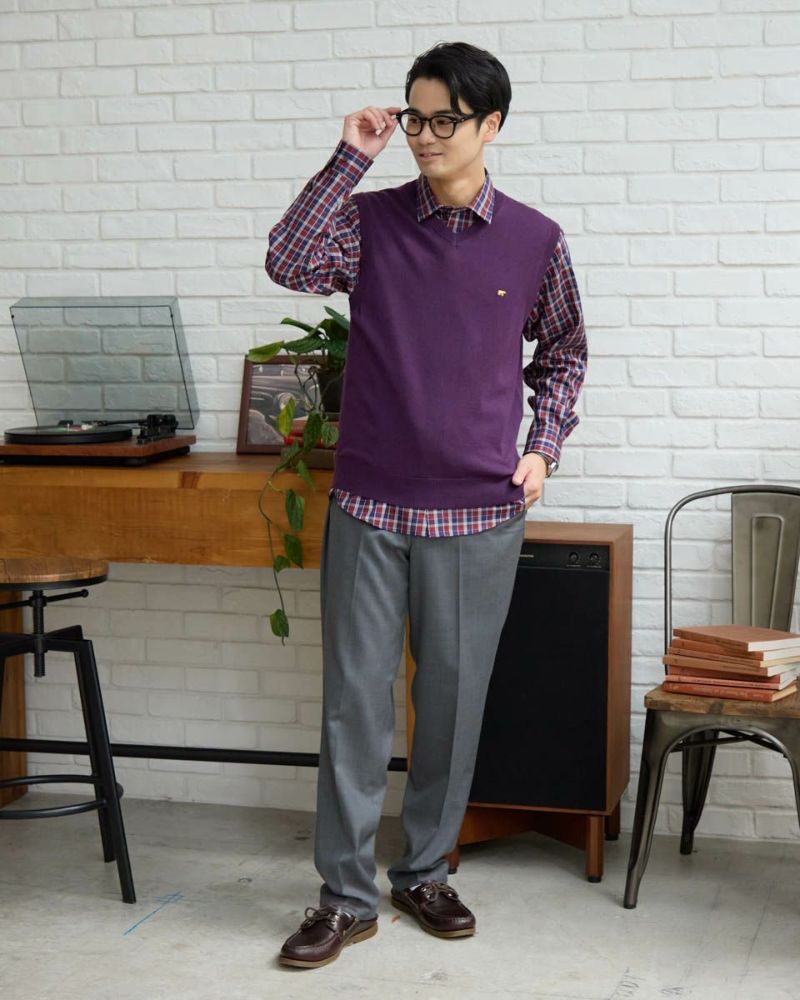ベーシックなVネックニットベストです。メリノウール100%を使用した12G天竺の編地です。優れた保温性と肌触りが特徴です。繊維がとても細かいため、チクチクする不快感を感じにくいのも魅力です。お手入れが楽な家庭洗濯 (手洗い)が可能です。ベーシックカラーはこちら モデル身長: 176 cm 着用サイズ: L サイズ Golden Bear Men's ニット (Men's) 【着用アイテム】314RD212 チェックシャツ 314RC402 ジャケット 317RC701 イージースラックス