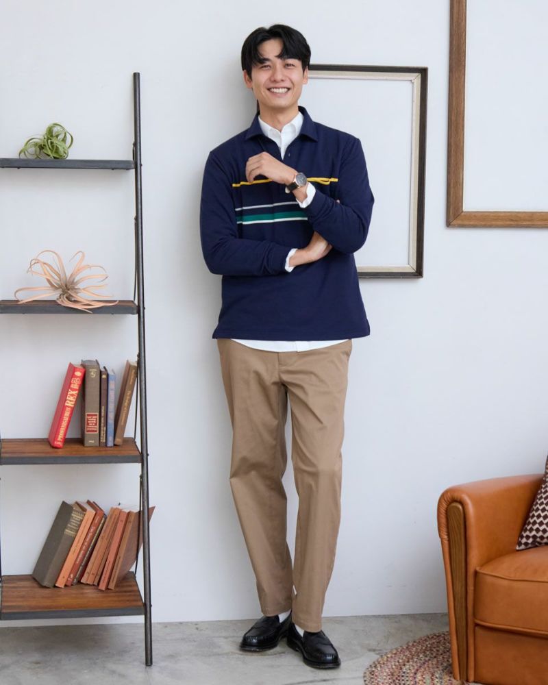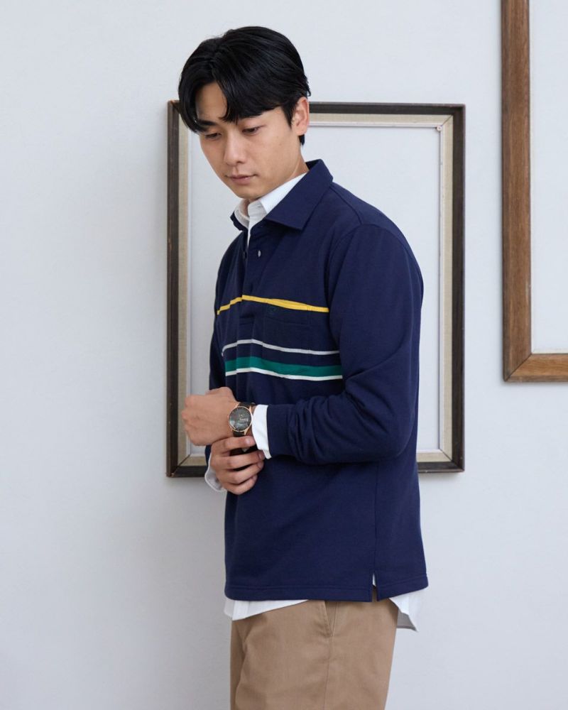 パネルボーダーの長袖ポロシャツです。暖かみのある裏起毛素材を使用しています。胸の大柄ボーダーがコーディネイトのアクセントに。中肉で1枚着としても活躍するポロシャツです。 モデル身長: 180 cm 着用サイズ: L サイズ Golden Bear MEN カットソー (MEN) 【着用アイテム】 314RC230 オックスシャツ 314RD412 ヘンリーネックTシャツ 314R8702 デニム 314RC704 ストレッチイージーパンツ