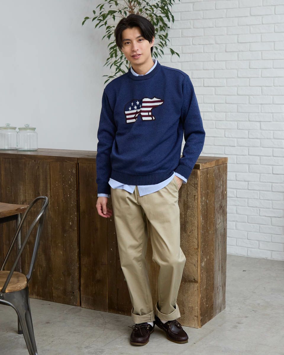 ニットとカットソーを切替えたクルーネックスウェットです。前身頃は星条旗モチーフのクマをジャカードで編み立てたニット素材。袖・後身頃はフリース素材を使用しています。家庭洗濯が可能でお手入れのしやすさがポイントです。 モデル身長: 180 cm 着用サイズ: L サイズ Golden Bear MEN カットソー (MEN) 【着用アイテム】314RC230 オックスシャツ 314RD433 吸湿発熱ハイネック長袖Tシャツ 314R8702 デニム