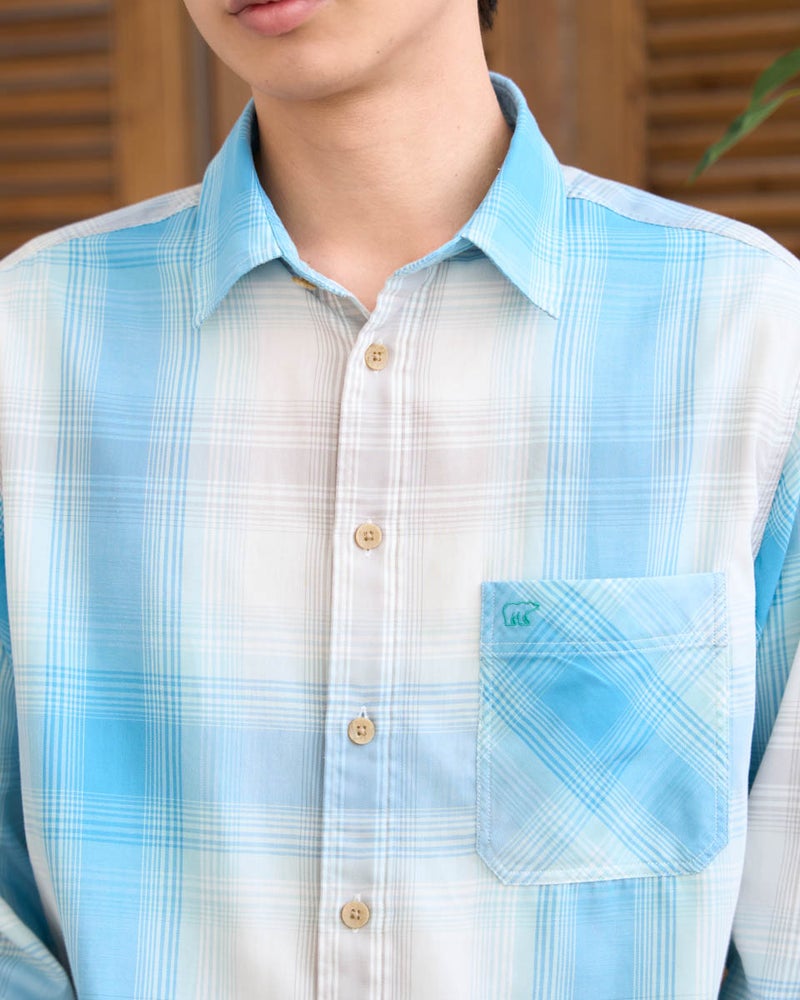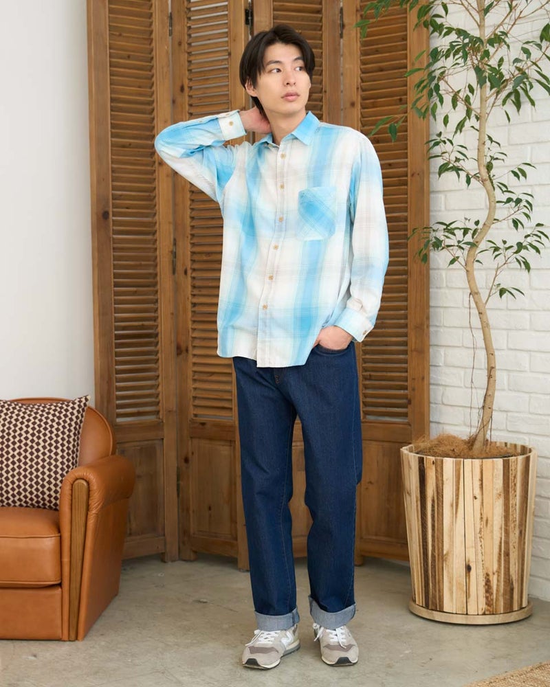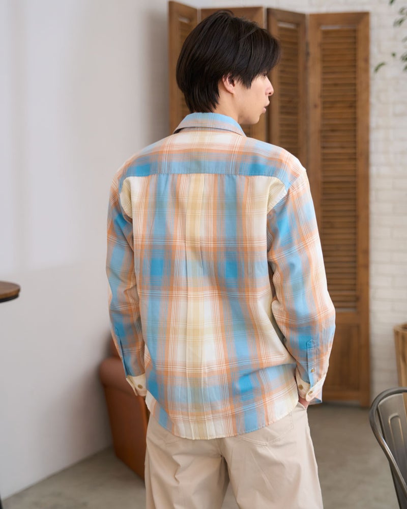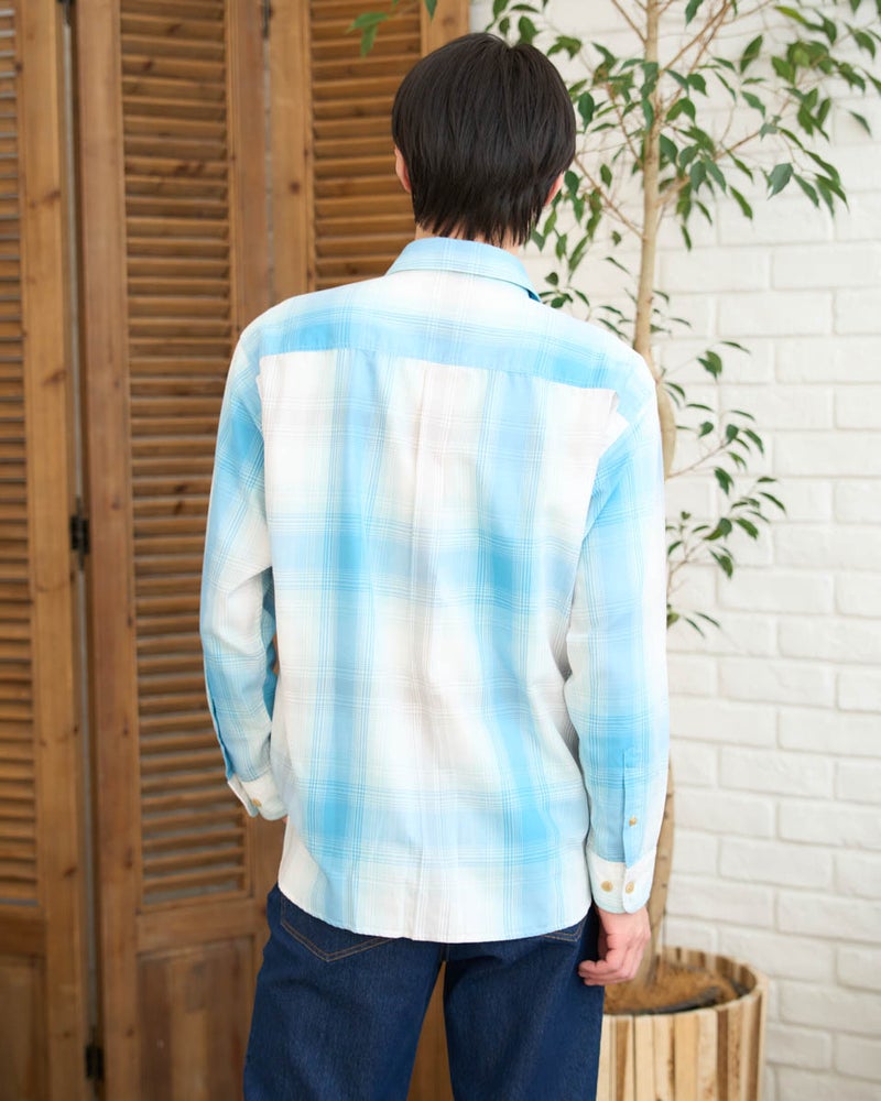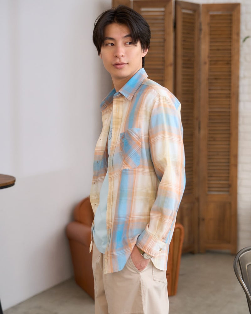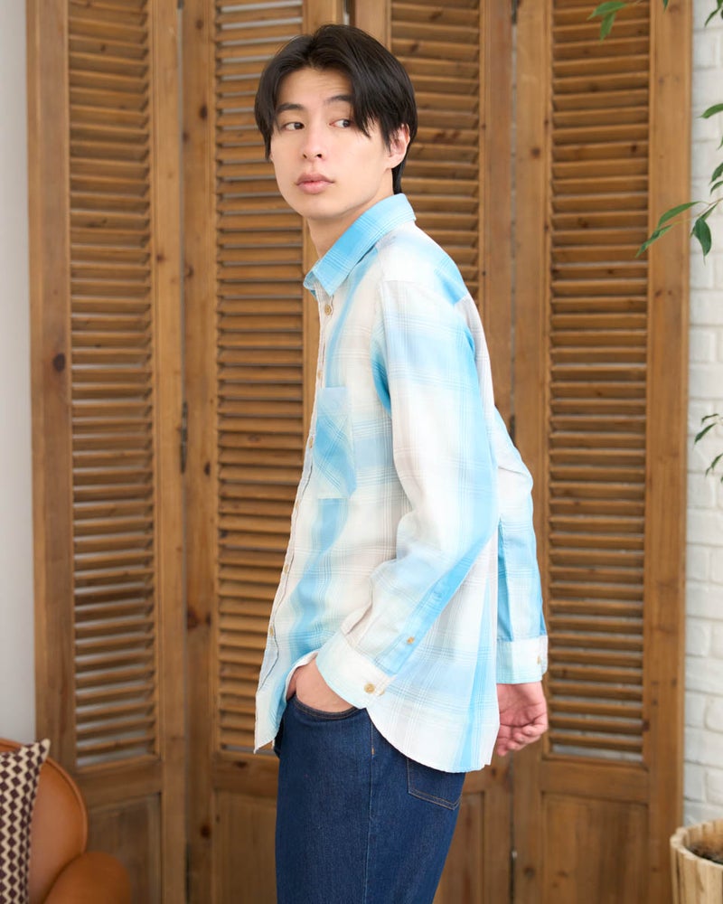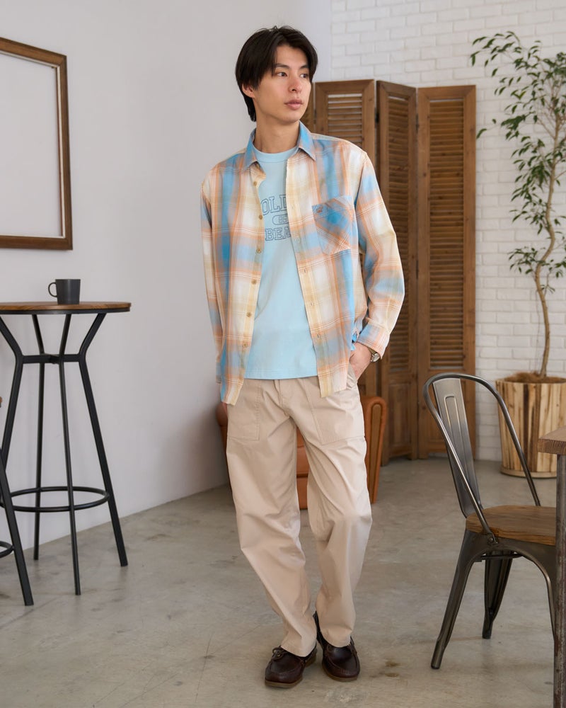 大人のこなれ感。やわらかなグラデーションが美しいオンブレチェックシャツ。同系色のグラデーションが特徴のオンブレチェック柄は、あなたの顔周りをパッと明るく見せてくれます。春らしい明るく柔らかな色合いが魅力。Tシャツの上からさっと羽織るだけで、たちまち旬のレイヤードスタイルが完成します。デニムに合わせたアメカジスタイルはもちろん、きれいめパンツと合わせても上品にまとまります。 モデル身長: 180 cm 着用サイズ: L サイズ Golden Bear MEN シャツ (MEN) 【着用アイテム】314U4513 ロゴTシャツ 314U3702 ベイカーパンツ 314U1702 ストレッチデニム