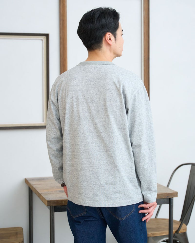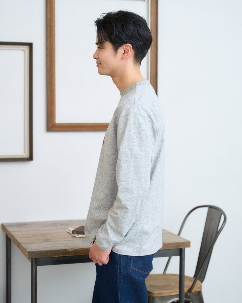 長袖のロゴグラフィックTシャツです。中肉の綿レーヨン混素材を使用しており、レーヨン特有のなめらかな質感が特徴です。カジュアルなロンTの概念を覆す、上品でソフトな着心地を実現しました。コーディネイトのアクセントに最適な一枚です。