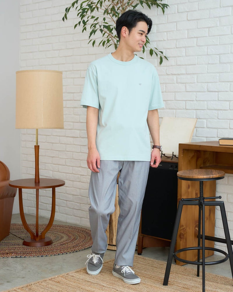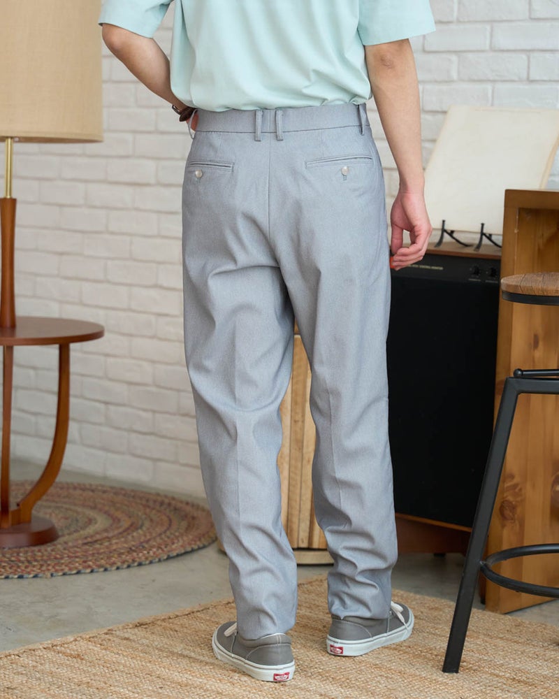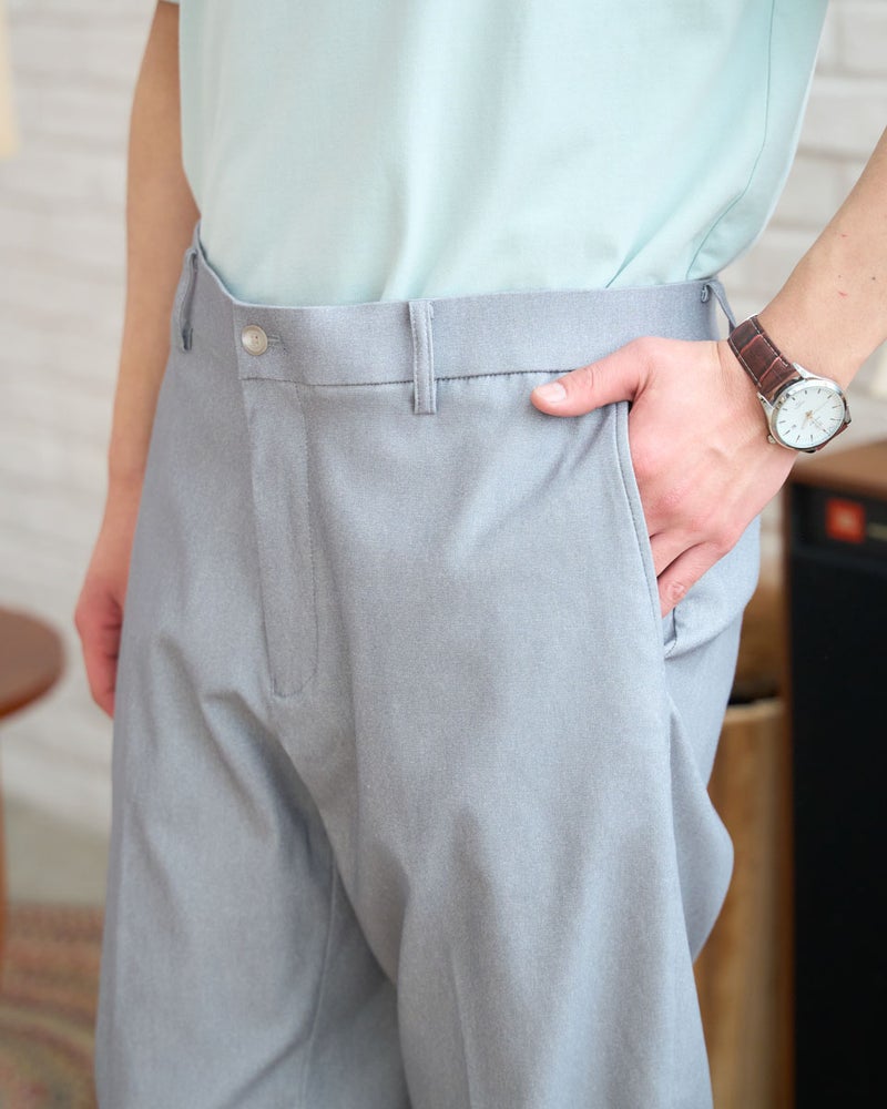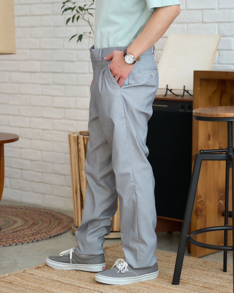 ストレッチ性に優れ、快適なはき心地を追求したスラックスです。伸長率はなんと150%、回復率は99%(24時間後)とすごくよく伸びて、すごくよく戻る超ストレッチ素材です。表情のある凹凸組織の生地で上品に仕上げました。シルエットは膝下から裾にかけて細くなるスリムフィット。ノータックですっきりとした印象です。