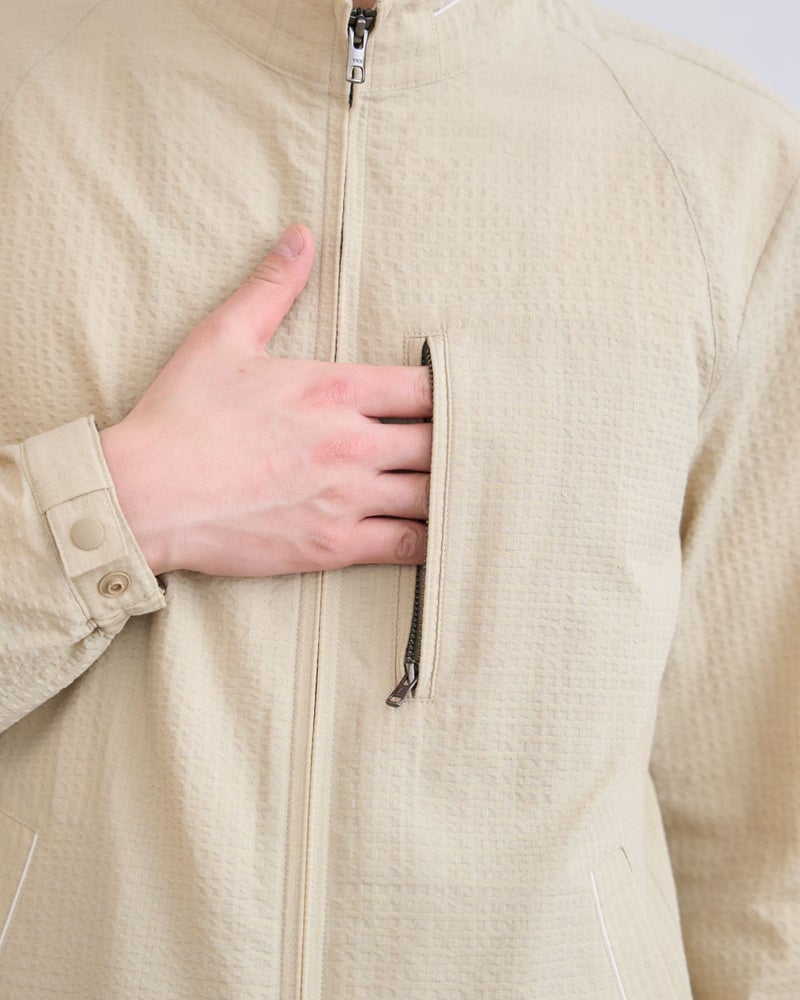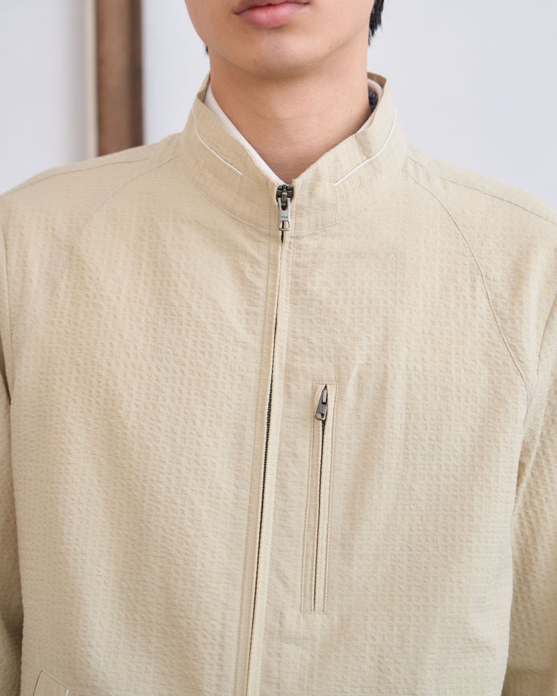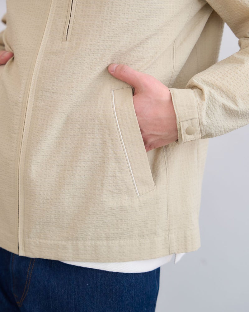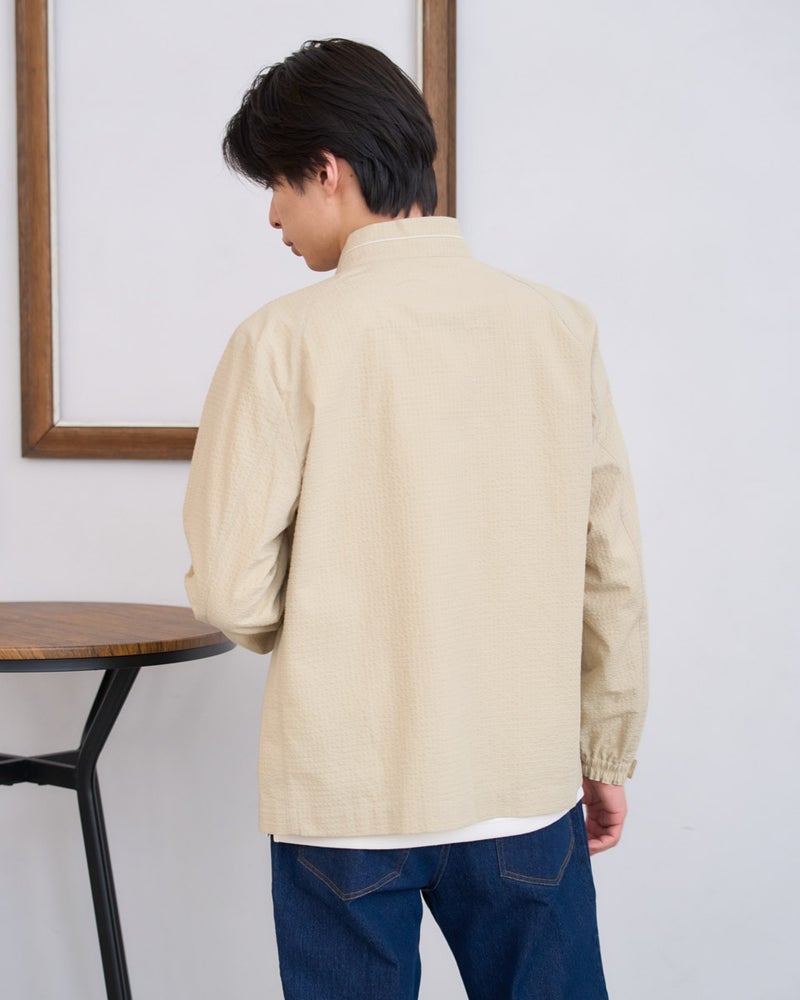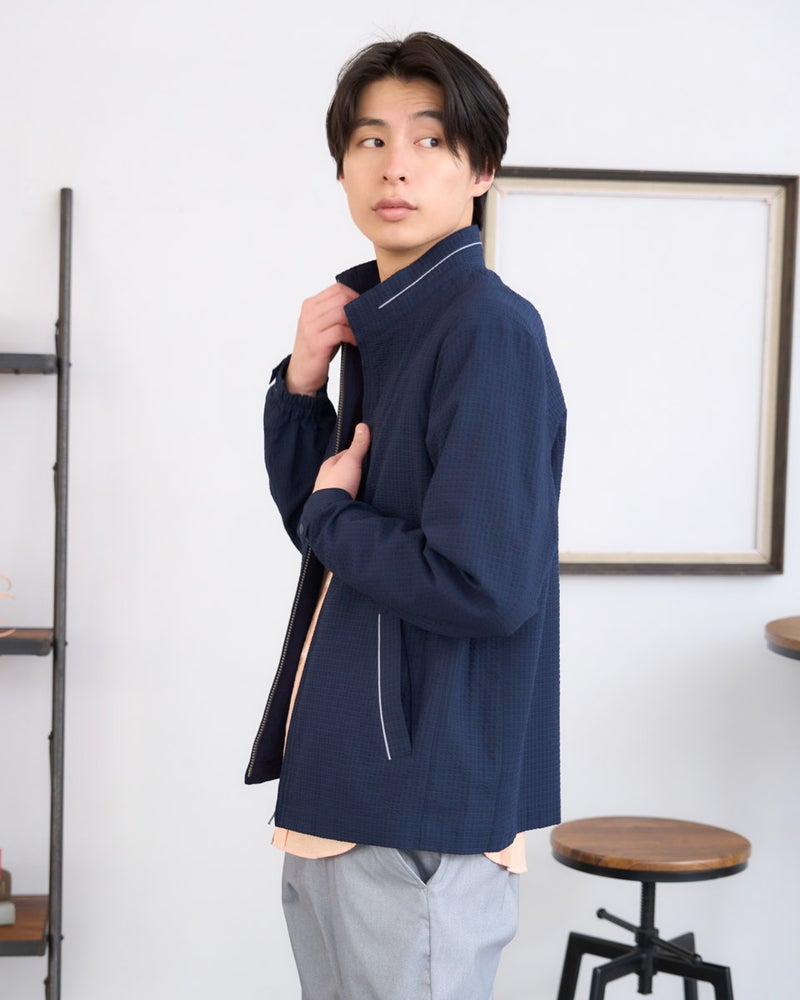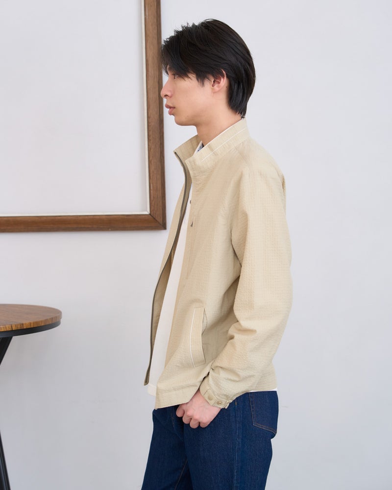 凹凸のあるシボ感が心地よい空羽サッカー素材を使用した、エアリーで非常に軽量なドライビングジャケットです。肌に触れる面積が少ないため通気性に優れ、気温が上がる日も涼やかで快適な着用感をキープします。襟端やポケット端、背裏にシャンブレー素材の別生地を配し、見えない部分の配色にも遊び心を効かせました。袖口のゴムアジャストでシルエットに変化をつけられるのも嬉しいポイント。ベーシックなベージュとネイビーの2色展開で、大人の休日スタイルに軽快なニュアンスを添えてくれる一着です。