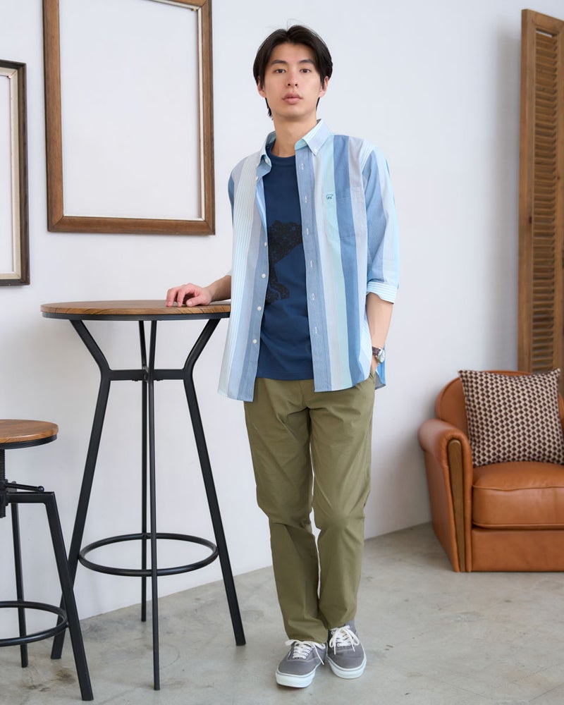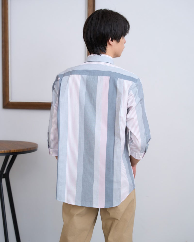 程よいハリ感のある綺麗めな素材を使用した、マルチストライプの七分袖シャツです。今シーズンのトレンドである、中間的な柔らかいトーンの色合いのストライプ柄が、日常のスタイルに優しくクリーンな彩りを添えてくれます。素材本来の端正な表情を活かしつつ、七分袖に仕上げることで、軽快で知的な印象を演出します。一枚での着用はもちろん、インナーとして差し色にしたり、カットソーの上から軽く羽織ったりと、気温やシーンに合わせた幅広いコーディネートを楽しめるのが魅力。シルエットは適度なゆとりを持たせたレギュラーフィットを採用しており、ボディラインを拾いすぎないリラックスした着心地を叶えてくれます。デニムやスラックスにさらりと合わせるだけで、大人の余裕漂うモダンなトラッドスタイルが完成する一着です。